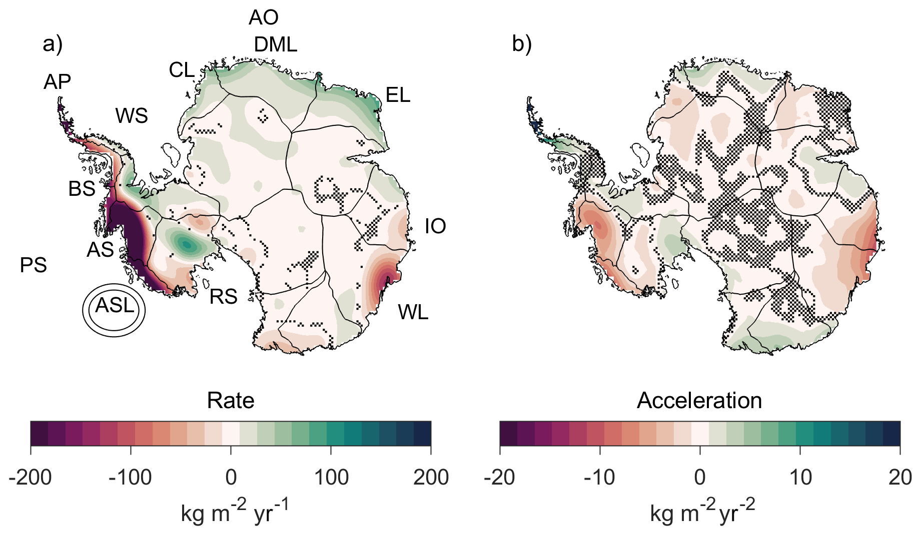 Figure 2(a) Linear rate and (b) acceleration of AIS mass change (2002–2022) based on GRACE data from using univariate regression. Key Antarctic regions are labelled: Antarctic Peninsula (AP), Bellingshausen Sea (BS), Amundsen Sea (AS), Amundsen Sea Low (ASL), Pacific Sector (PS), Ross Sea (RS), Indian Ocean (IO), Atlantic Ocean (AO), Wilkes Land (WL), Enderby Land (EL), Dronning Maud Land (DML), Coats Land (CL), and Weddell Sea (WS). Stippling indicates areas not statistically significant (ρ>0.05). Significance tests do not reflect the effects of temporal correlations in these data (Williams et al., 2014).