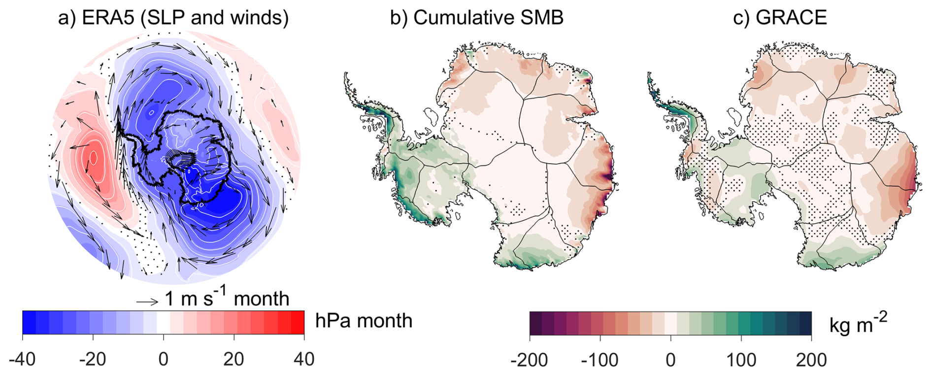 Similarly, the 2007–2009 La Niña period shows a mass pattern that contrasts with other La Niña periods, featuring a positive mass anomaly in the Amundsen Sea sector (Fig. 5i). However, atmospheric circulation patterns during this period do not statistically support the observed mass gain, suggesting that it may be linked to unrelated weather events or other modes of climate variability.