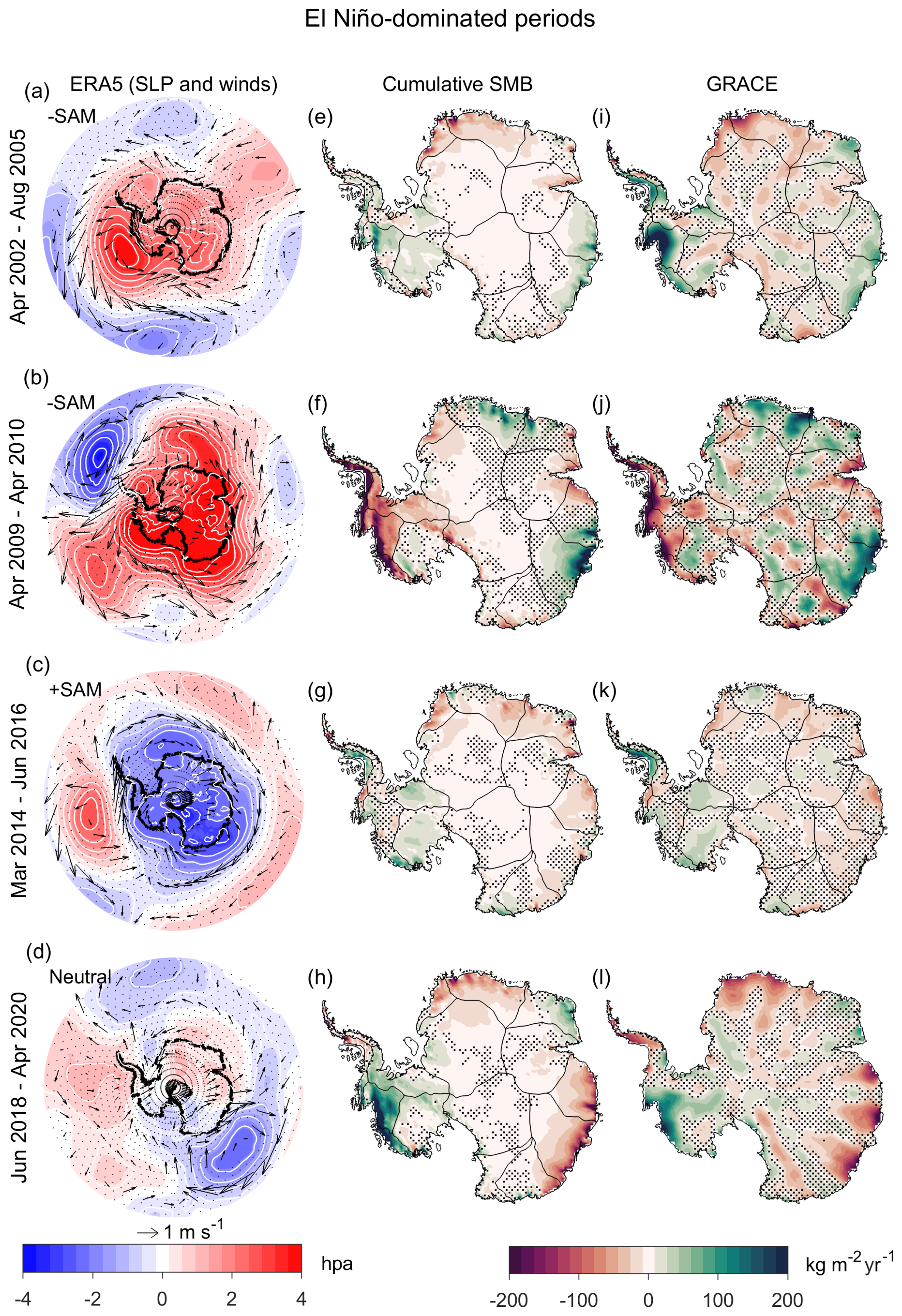Figure 4Atmospheric circulation anomalies relative to the GRACE period (2002–2022) (a–d), rate of change in cumulative SMB anomalies from RACMO2.4p1 model (e–h) and linear rate of GRACE-derived ice mass anomalies (i–l) during El Niño-dominated period. Sea level pressure anomalies are shown as shaded regions with contours (hPa), while wind anomalies are indicated by reference vectors (m s−1). SMB and GRACE maps (kg m−2 yr−1) illustrate variability in AIS mass for each identified El Niño-dominated period. The GRACE signal is more reliable in the coastal regions and less reliable in the interior, where GRACE systematic error in the form of north-south striping is more evident. Non-significant areas are stippled for the pressure anomalies and AIS mass trend at p value >0.05.