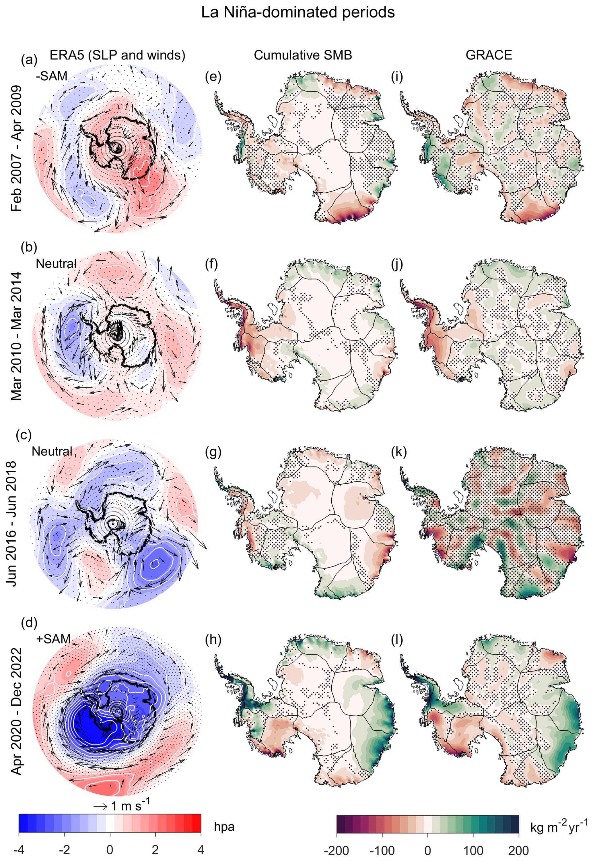 Figure 5Atmospheric circulation anomalies relative to the GRACE period (2002–2022) (a–d), rate of change in cumulative SMB anomalies from the RACMO2.4p1 model (e–h), and linear rate of GRACE-derived ice mass anomalies (i–l) during La Niña-dominated period. Sea level pressure anomalies are shown as shaded regions with contours (hPa), 10 m wind anomalies are indicated by reference vectors (m s−1). SMB and GRACE (kg m−2 yr−1) maps illustrate variability in AIS mass for each identified La Niña-dominated period. The GRACE signal is strongest near the coastal regions and weaker in the interior, where uncertainties are higher. The GRACE satellite malfunction during 2016–2018 is apparent in the signal for that period, where instrument noise dominates over actual variability with pronounced north-south striping. Non-significant areas are stippled for the pressure anomalies and AIS mass trend at p value >0.05.