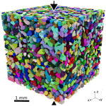 The simulations were conducted using the Fast Fourier Transform (FFT)-based solver AMITEX_FFTP (Gelebart et al., 2020), using the small perturbation assumption. This solver employs a modified Green operator based on a hexahedral finite difference scheme (Willot, 2015), equivalent to using linear hexahedral finite elements with reduced integration (Schneider et al., 2017), and an Anderson convergence acceleration technique (Anderson, 1965), enabling the analysis of porosities (infinite contrast with the solid matrix) up to 90 %. The crystal plasticity model was implemented using the MFront code generator (Helfer et al., 2015). The numerical integration of crystal plasticity is computationally expensive (approximately 12 h on the sample presented in Fig. 3 of size voxels, on a high-performance computer with 256 IntelXeon Gold 6130 cores). However, the solver benefits from the MPI implementation.