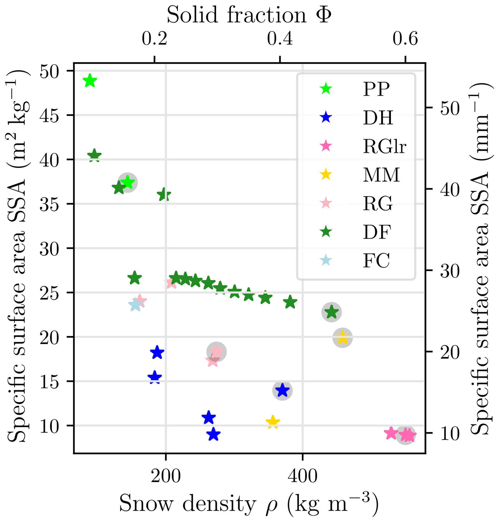 Figure 1Characteristics of the 3D microstructures used in this study. The snow types are described and coloured according to the International Classification for Seasonal Snow on the Ground (Fierz et al., 2009): Precipitation Particles (PP), Decomposing and Fragmented Precipitation Particles (DF), Rounded Grains (RG), Large Rounded Grains (RGlr), Faceted Crystals (FC), Depth Hoar (DH), Machine Made (MM). The microstructures enclosed by a black circle correspond to those shown in Fig. 2.