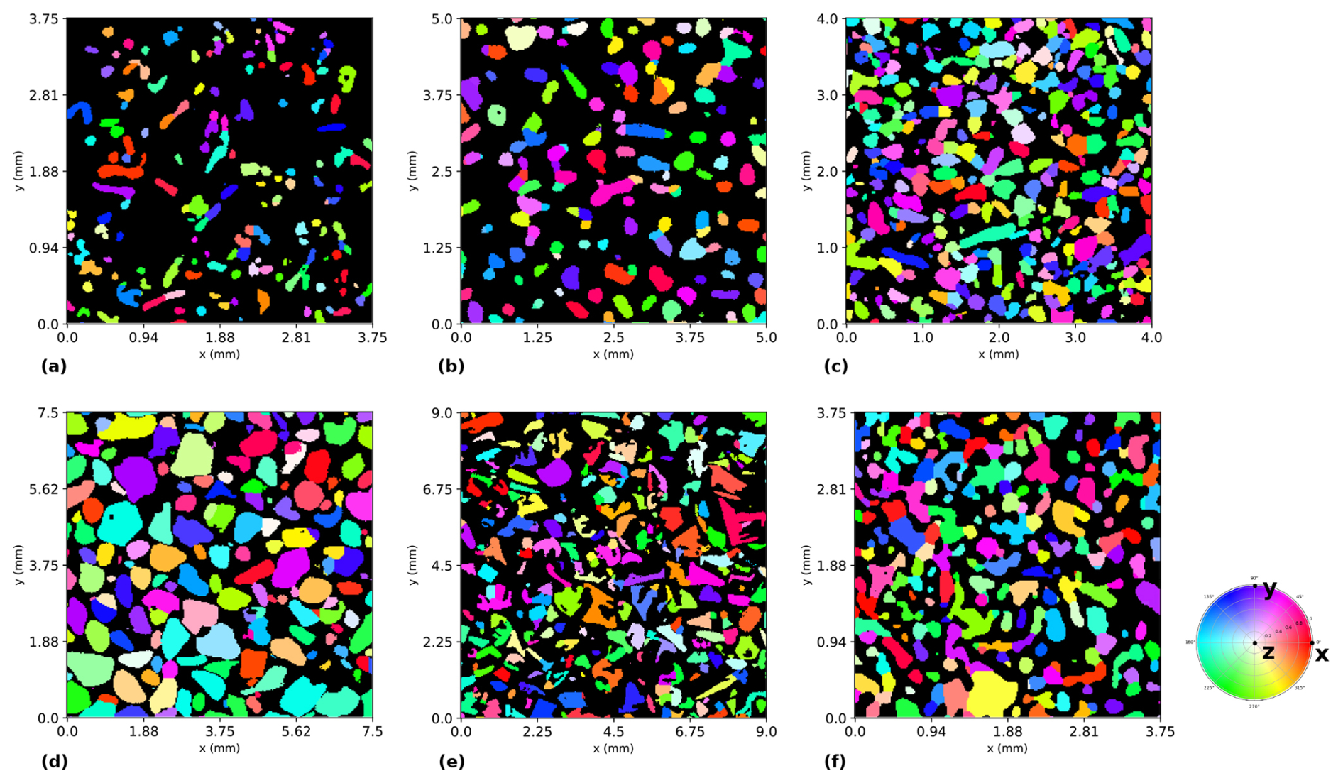 Figure 2Example of the c-axis orientation of different samples: (a) PP, (b) RG, (c) DF, (d) RGlr, (e) DH, (f) MM. Each colour represents a specific c-axis orientation, as indicated by the accompanying colour wheel. The black background corresponds to the original air pores within the snow microstructure. Note that the simulation volumes are 3D. Here, only 2D slices are shown.