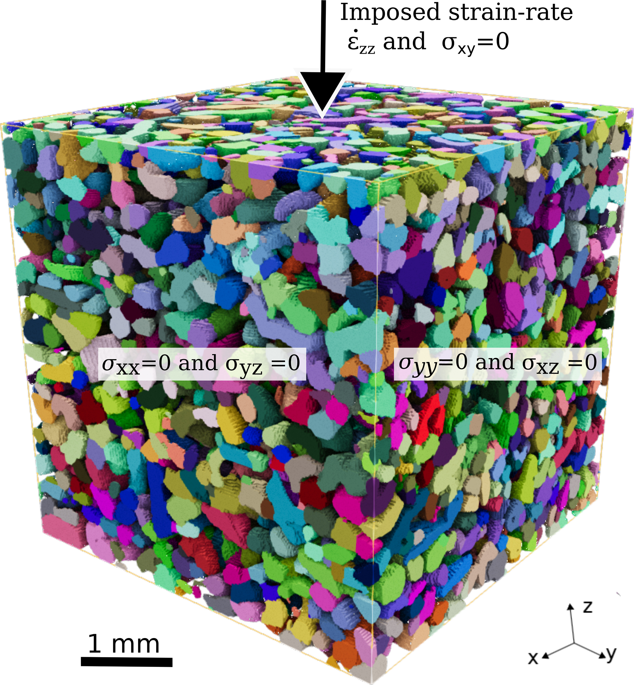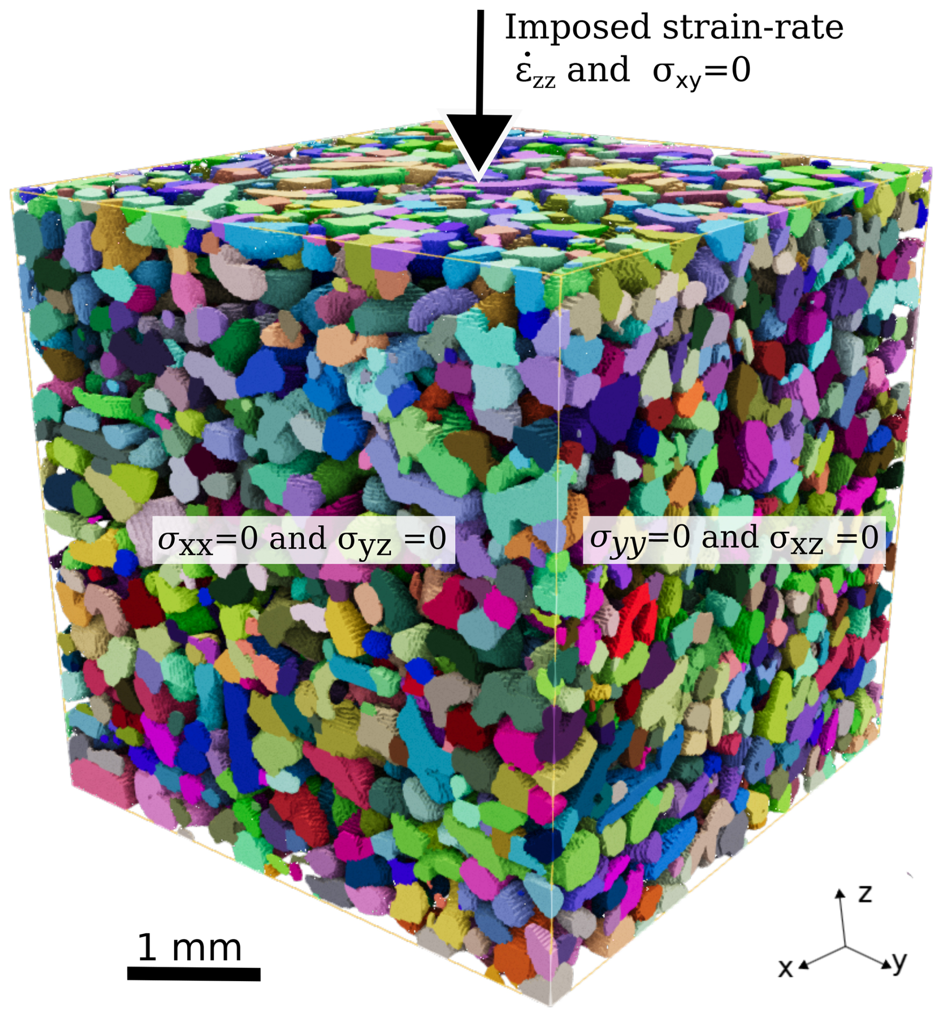 For the boundary conditions, we prescribed vertical uniaxial compression with periodic boundary conditions (Fig. 3). We imposed a positive average vertical strain rate and zero average lateral stresses, , and zero average shear stresses, . Here, the macroscopic strain and stress tensors are defined as volume average on the sample: and , respectively (Hill, 1963). These boundary conditions mimic the conditions of snowpack densification, where gravity is the primary driving force and the influence of confining pressure is negligible (Wautier et al., 2017). We measured the resulting average vertical stress σzz from the simulations. By convention, as the problem is purely compressive, both the strain rate and stress are defined as positive.