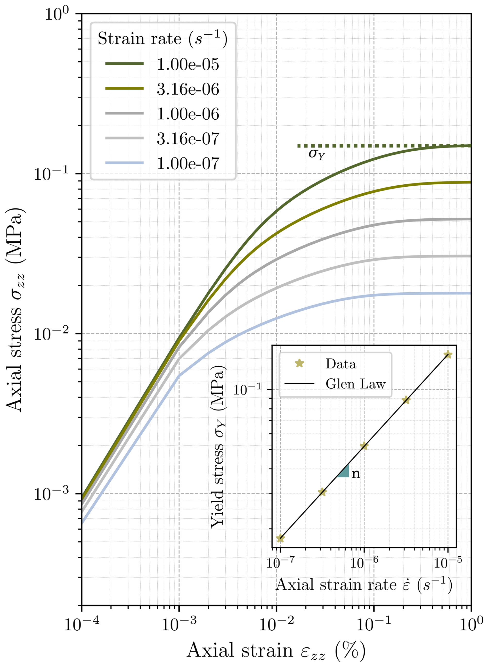 Figure 4 illustrates the uniaxial compression of the exemplary microstructure shown in Fig. 3, under strain rates ranging from 10−7 to . We observe three different regimes of the stress-strain response (Fig. 4). First, the axial stress σzz increases almost linearly with strain in an elastic regime. Indeed, at very low stress levels and short times, the viscoplastic strain is negligible. Then, σzz deviates from the elasticity, and the viscoplasticity is progressively activated. After this transient regime, σzz eventually reaches a constant value, the flow stress σY, where the microstructure flows perfectly (stationary creep). The flow stress depends on the microstructure and the applied strain rate. In our simulations, the permanent viscoplastic regime is reached after a typical strain of 0.5 %. This is consistent with the steady (minimum) strain rate of polycrystalline ice, commonly measured around 1 % (Mellor and Cole, 1982; Jacka, 1984; Treverrow et al., 2012). Consequently, we conduct simulations up to 1 % strain to determine the flow stress σY.