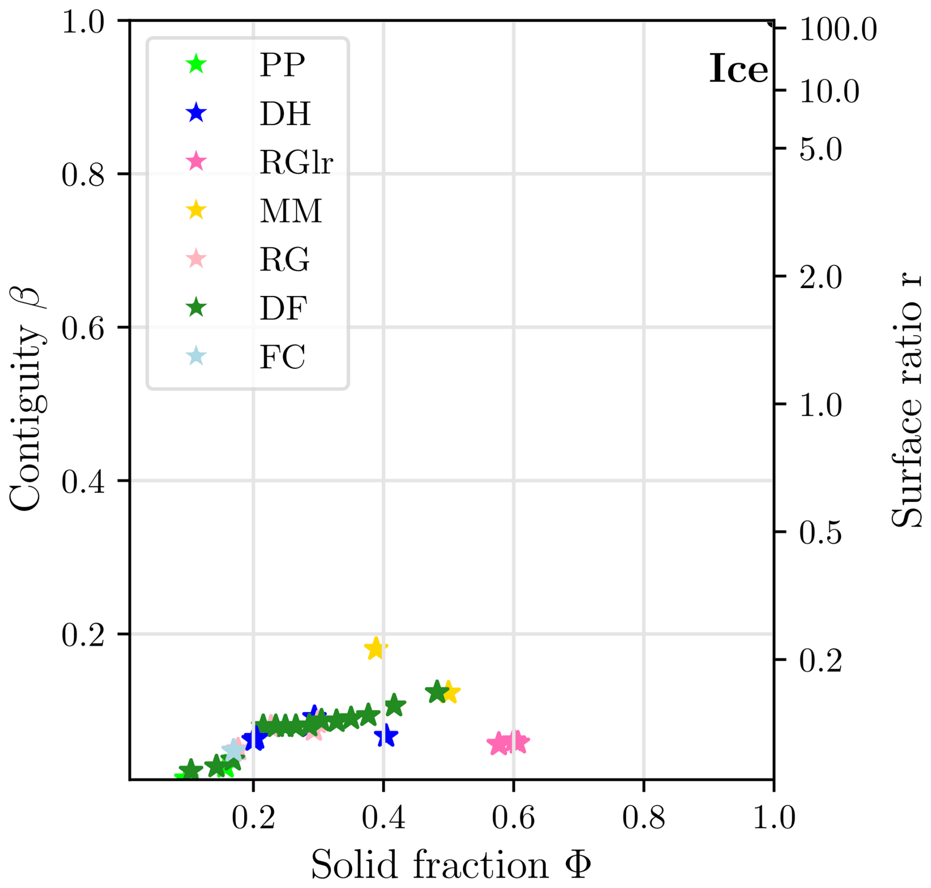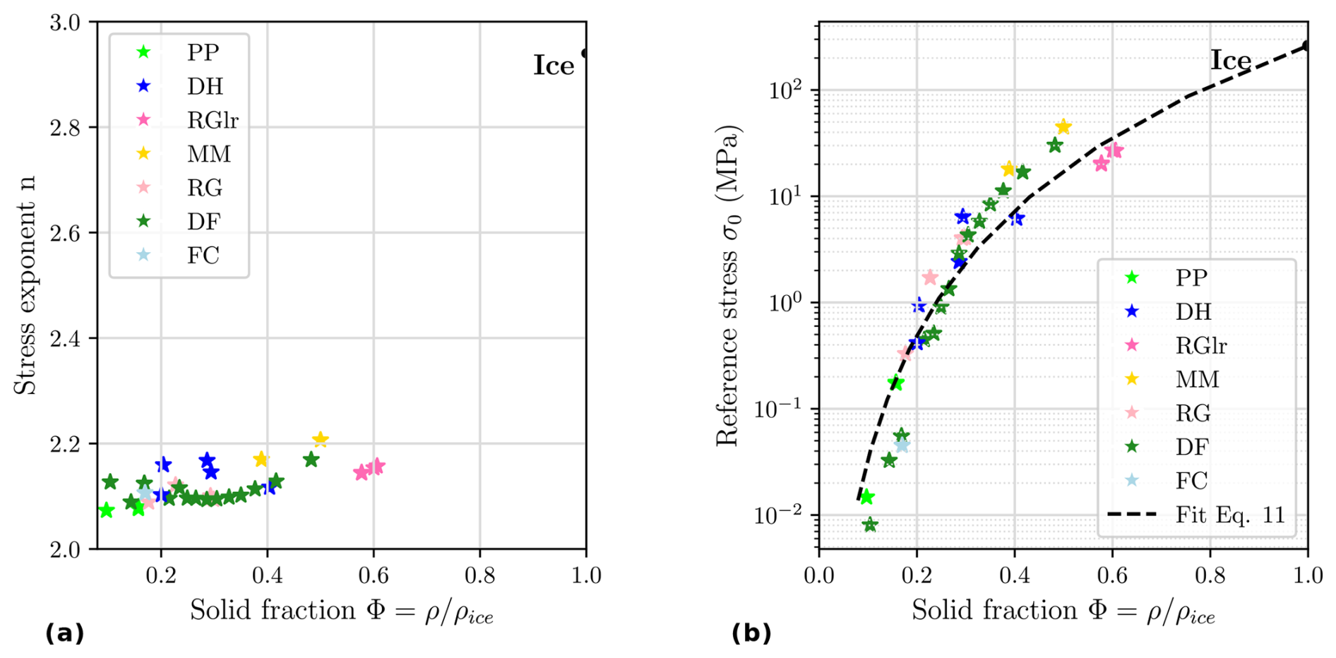 The reference stress σ0 increases with the solid fraction Φ (Fig. 5b). Indeed, when the solid fraction increases, the stress supported by the ice skeleton (for a given macroscopic stress σ averaged in air and ice) decreases, leading to an increase of the reference stress. Following Védrine et al. (2025), we fitted the evolution of σ0 with Φ with a power-law: