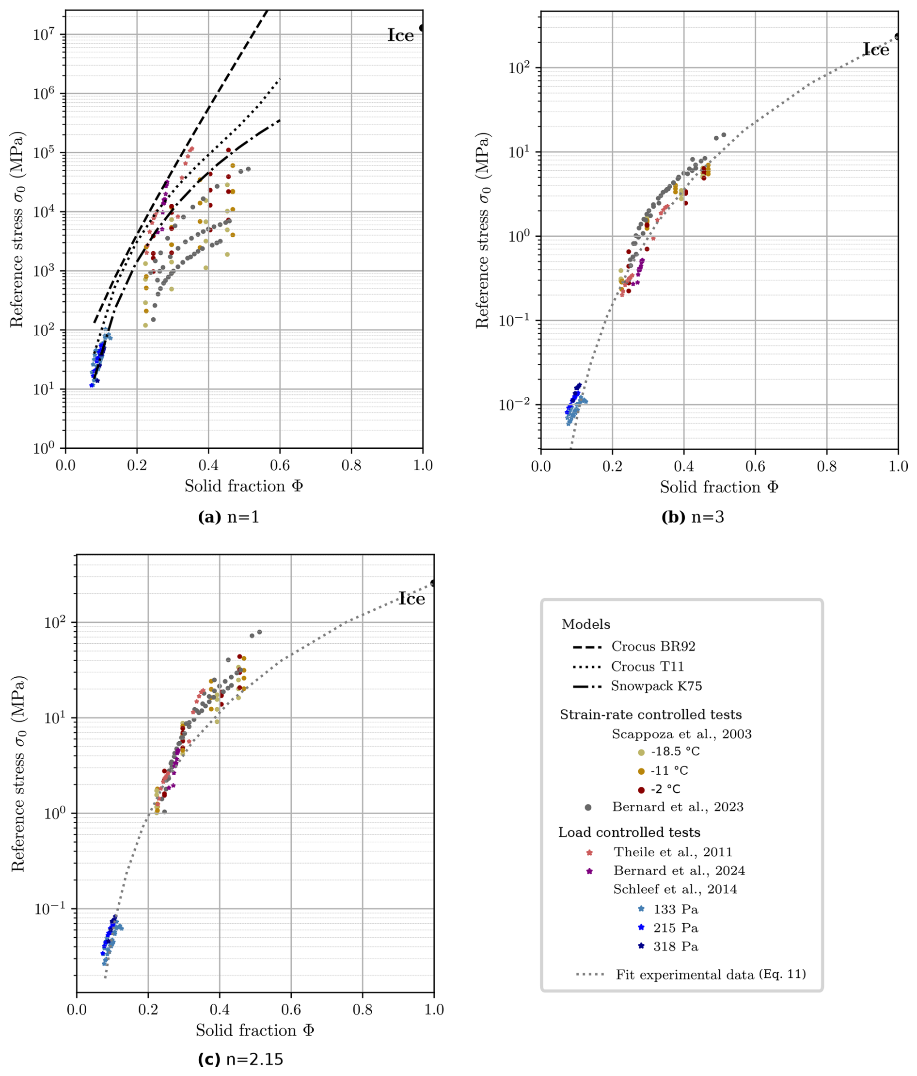 n=1 (Fig. 6a). When the viscoplastic behaviour is assumed to be linear, we observe significant dispersion in the reference stress σ0 (ℒ=0.87), particularly at solid fractions exceeding 0.2. Notably, the dataset is divided into two distinct groups: the tests with imposed strain rates are located in the lower part of the scatter plot, while the creep tests are located in the upper part. This dispersion and the separation into two groups indicate that a linear model fails to adequately reproduce the variety of experimental data. Figure 6 also includes the linear models from Brun et al. (1992), Teufelsbauer (2011) and Kojima (1975) at a temperature of −10 °C. The Br92 model overestimates all experimental reference stresses and thus appears too fluid. Moreover, it reaches the viscosity of ice for an ice volume fraction of about 0.5. The T11 model also tends to overestimate the reference stress but aligns more closely with the experimental values for low-density snow measured by Schleef et al. (2014b). Finally, the K75 model reproduces the experiments of Schleef et al. (2014b) with good fidelity and lies near the centre of the experimental data set.