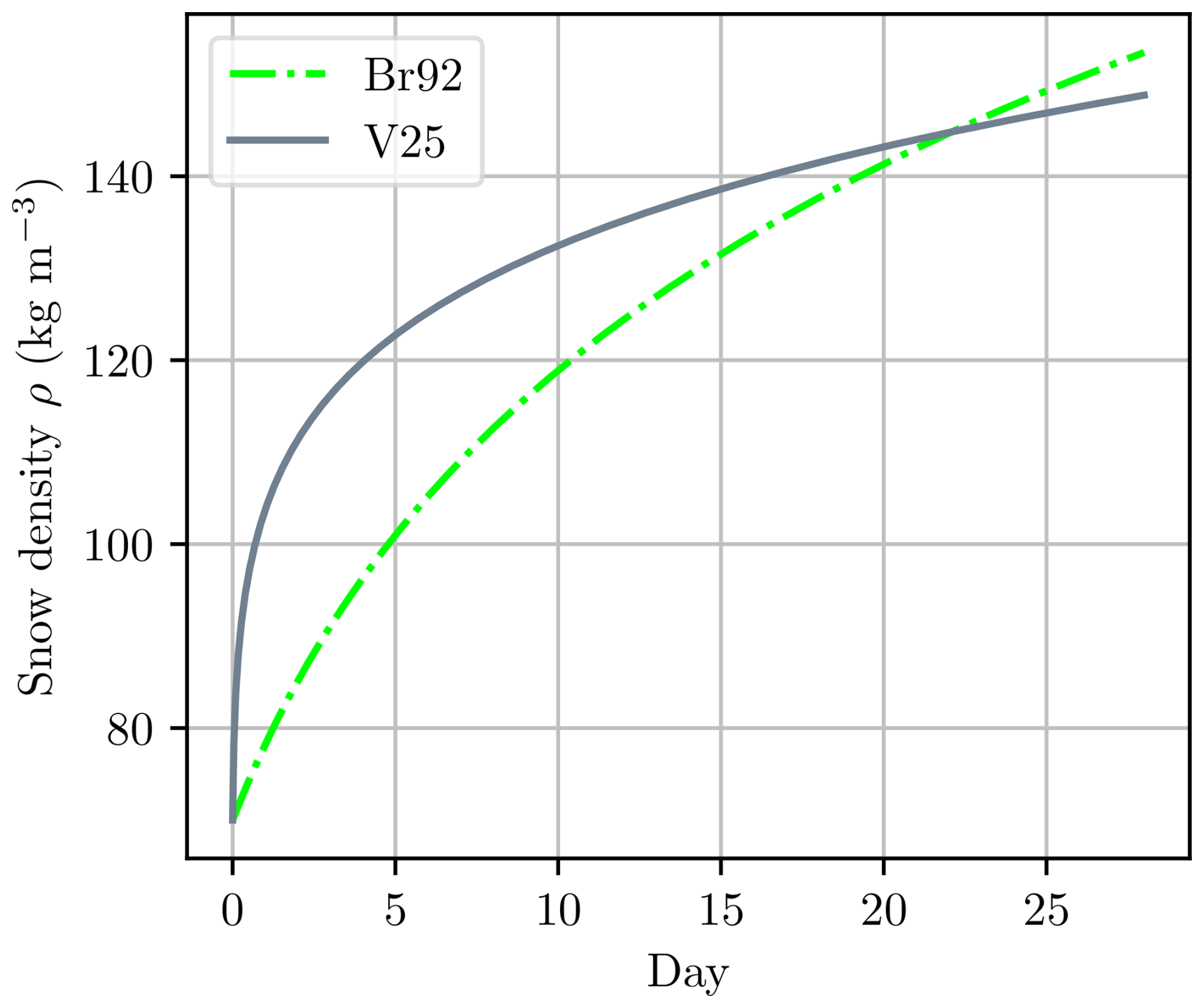 Under its weight, snow naturally settles from an initial density of approximately 100 kg m−3 just after deposition on the ground to about 500 kg m−3 at the end of the winter season, and up to the ice density for perennial snow on glaciers and ice sheets. Snow settlement is a key process of the snowpack evolution (Brun et al., 1992; Lehning et al., 2002; Simson et al., 2021). Predicting snow density is thus essential for many applications, such as avalanche forecasting (Morin et al., 2020), hydrology (Barnett et al., 2008), surface mass balance in polar regions (Morris and Wingham, 2014), or paleoclimatology (Barnola et al., 1987).