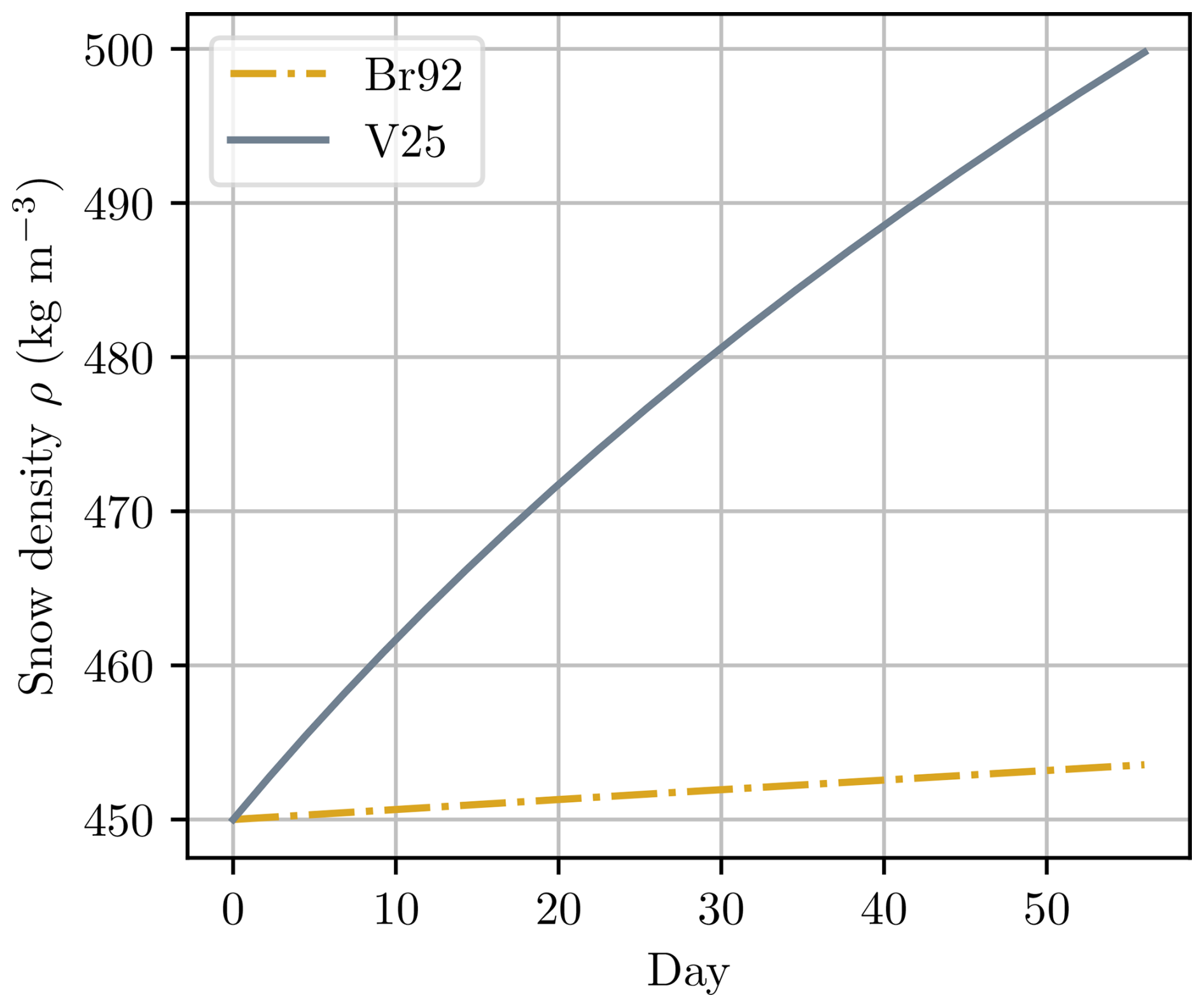 Wind-packed surface layers. We consider the bottom of a 10 cm thick layer of snow with a density of 250 kg m−3 (Φ=0.22, σ=0.25 kPa, see blue point on Fig. 8). This layer typically forms at the snowpack surface during a wind event. The V25 model predicts a densification rate about six times slower in the first few days compared to the Br92 model (see Fig. 10). This result aligns with observations of limited densification of basal layers in Arctic snowpacks–behaviour that is not well captured by existing parametrisations (Woolley et al., 2024). Nevertheless, our model does not distinguish snow types and cannot predict the distinct densification rates observed between RG and DH at a given density (Fourteau et al., 2023).