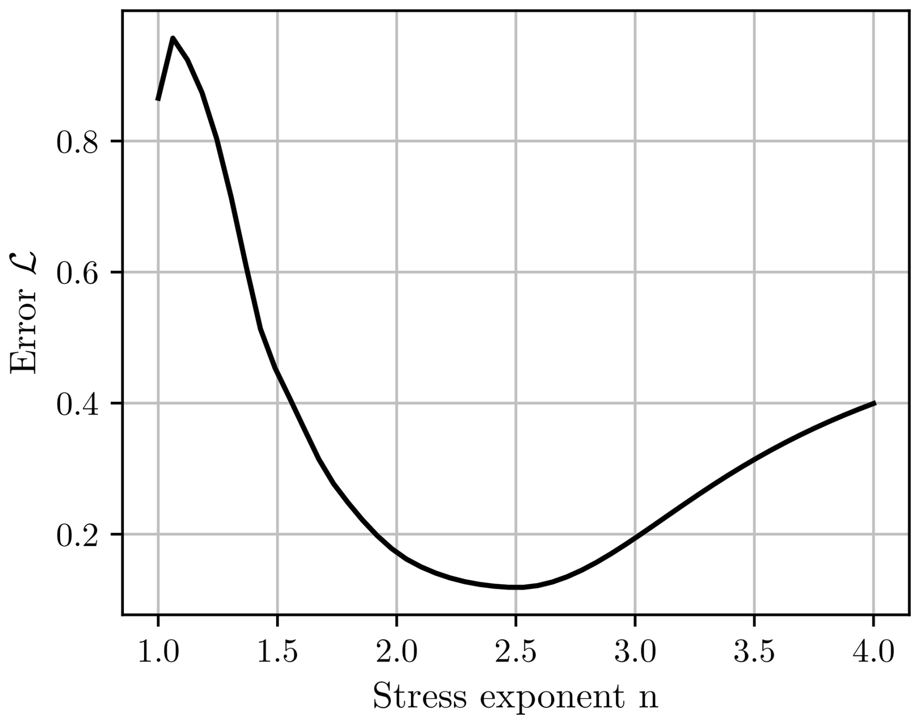 Figure C1 shows the evolution of the dispersion ℒ as a function of n. ℒ decreases when n increases from 1 to 2.35. For n in [2.35, 2.59], ℒ remains nearly constant with a weak minimum at n=2.53. For n>2.59, ℒ increases with n. Interestingly, the minimum dispersion error is obtained for a value of n close to the one obtained from microstructure-based simulations. This parametrization significantly improves the modelling of the viscoplastic behaviour of snow. The exponent n=2.15 is consistent with the value derived by Scapozza and Bartelt (2003b) and Schleef et al. (2014b) on samples with low density (Φ<0.2). This agreement supports the idea that basal glide is the dominant mechanism at low density. Furthermore, this suggests that the reduction of the stress exponent from dense ice to snow does not require introducing grain boundary sliding (GBS) as an additional deformation mechanism. GBS was originally proposed by Alley (1987) and Goldsby and Kohlstedt (1997) to explain observations of flow stress sensitivity at low solid fractions and is associated with a stress exponent of n≈2 in fine-grained ice (Goldsby and Kohlstedt, 2001). Our work shows that the low crystalline frustration in snow provides an alternative physical explanation for the reduced stress exponent observed in snow.