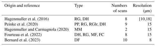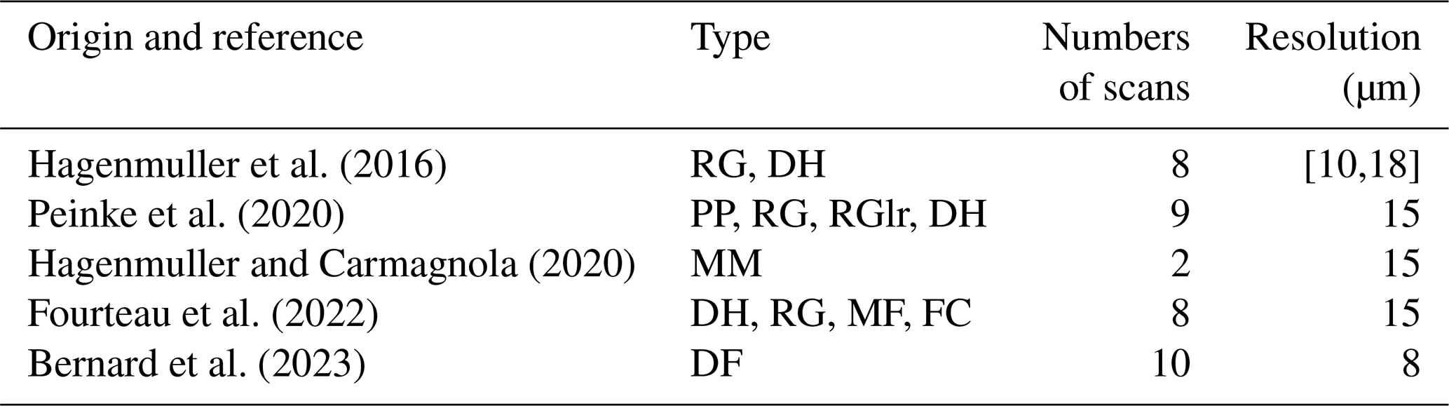 Hagenmuller et al. (2016)Peinke et al. (2020)Hagenmuller and Carmagnola (2020)Fourteau et al. (2022)Bernard et al. (2023)Table 1Sample origin and reference papers, type and number of samples and voxels size (range) of images used in this study.