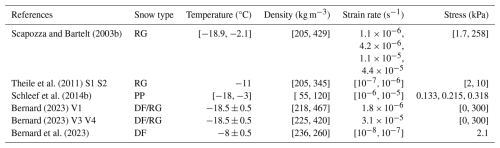 Scapozza and Bartelt (2003b)Theile et al. (2011)Schleef et al. (2014b)Bernard (2023)Bernard (2023)Bernard et al. (2023)Table 2Characteristic of the experimental data of snow creep used.