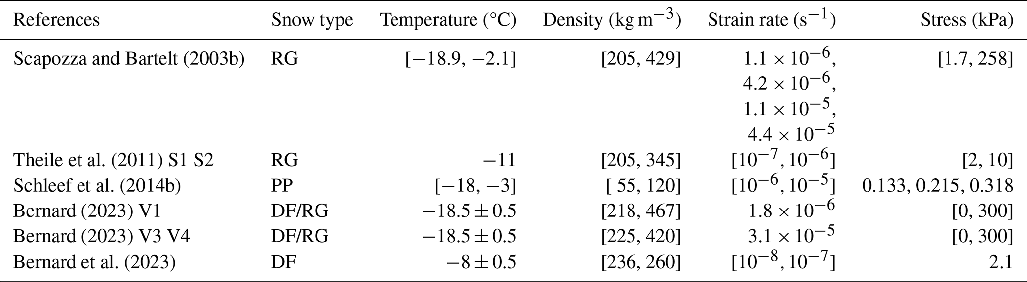 To characterize the viscoplastic behaviour of snow, two types of mechanical tests are commonly employed: load-controlled tests (creep tests) (Mellor and Testa, 1969b; Desrues et al., 1980; Bartelt and Christen, 1999; Kirchner et al., 2001; Scapozza and Bartelt, 2003a, b; Moos et al., 2003) and strain rate controlled tests (Scapozza and Bartelt, 2003a; Bernard, 2023). We selected experimental data from such tests, where the initial density, temperature, stress, and strain rate were measured during the experiments. To focus exclusively on the viscoplastic behaviour, only tests with a strain rate lower than s−1 were selected (Kirchner et al., 2001; Barraclough et al., 2017; Löwe et al., 2020; Bernard, 2023). Our dataset comprises 92 measurements obtained from strain rate-controlled tests and 86 measurements obtained from stress-controlled tests (Scapozza and Bartelt, 2003b; Theile et al., 2011; Schleef et al., 2014b; Bernard, 2023; Bernard et al., 2023). One measurement comprises the measured strain rate and stress and essential information such as initial ice volume fraction Φ, temperature T and loading conditions (load or strain-controlled). The data is summed up in Table 2 and fully available in Védrine and Hagenmuller (2025).