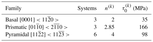 Air was modelled as an infinitely soft elastic medium. An elasto-viscoplastic law modelled the mechanical behaviour of each ice crystal. The elasticity tensor was assumed isotropic transverse in the crystal frame and defined according to Gammon et al. (1983). The viscoplastic part follows the crystal plasticity law proposed by Castelnau et al. (2008), Lebensohn et al. (2009), and Suquet et al. (2012). Ice crystals deform through slip on three soft basal systems, three hard prismatic systems, and six hard pyramidal systems (Montagnat et al., 2014; Weikusat et al., 2017). Each slip system (k) is governed by a Norton-type flow law, characterised by a prefactor, the reference shear rate , a stress exponent n(k), and a critical shear stress . Different parametrizations of the slip systems have been proposed in the literature for different purposes: to investigate the viscoplastic development of texture (Castelnau et al., 1996), to model the viscoplastic behaviour and heterogeneous intracrystalline deformation of columnar ice polycrystals (Lebensohn et al., 2009), or to simulate the transient regime (Suquet et al., 2012; Castelnau et al., 2008). However, as shown by Védrine et al. (2025), a key point for modelling snow behaviour is to set the exponent for the basal system equal to 2, as extensively experimentally observed (Duval et al., 1983; Schulson and Duval, 2009). We therefore used the stationary parametrization of Suquet et al. (2012), calibrated to reproduce the viscoplastic behaviour of dense polycrystalline ice ( and nsuquet=2.94) as proposed by Budd and Jacka (1989) and Castelnau et al. (1996) at T0=263.15 K (for more details see Appendix A). To account for temperature effects, we used the Arrhenius relation proposed by Mellor and Testa (1969a), i.e., with