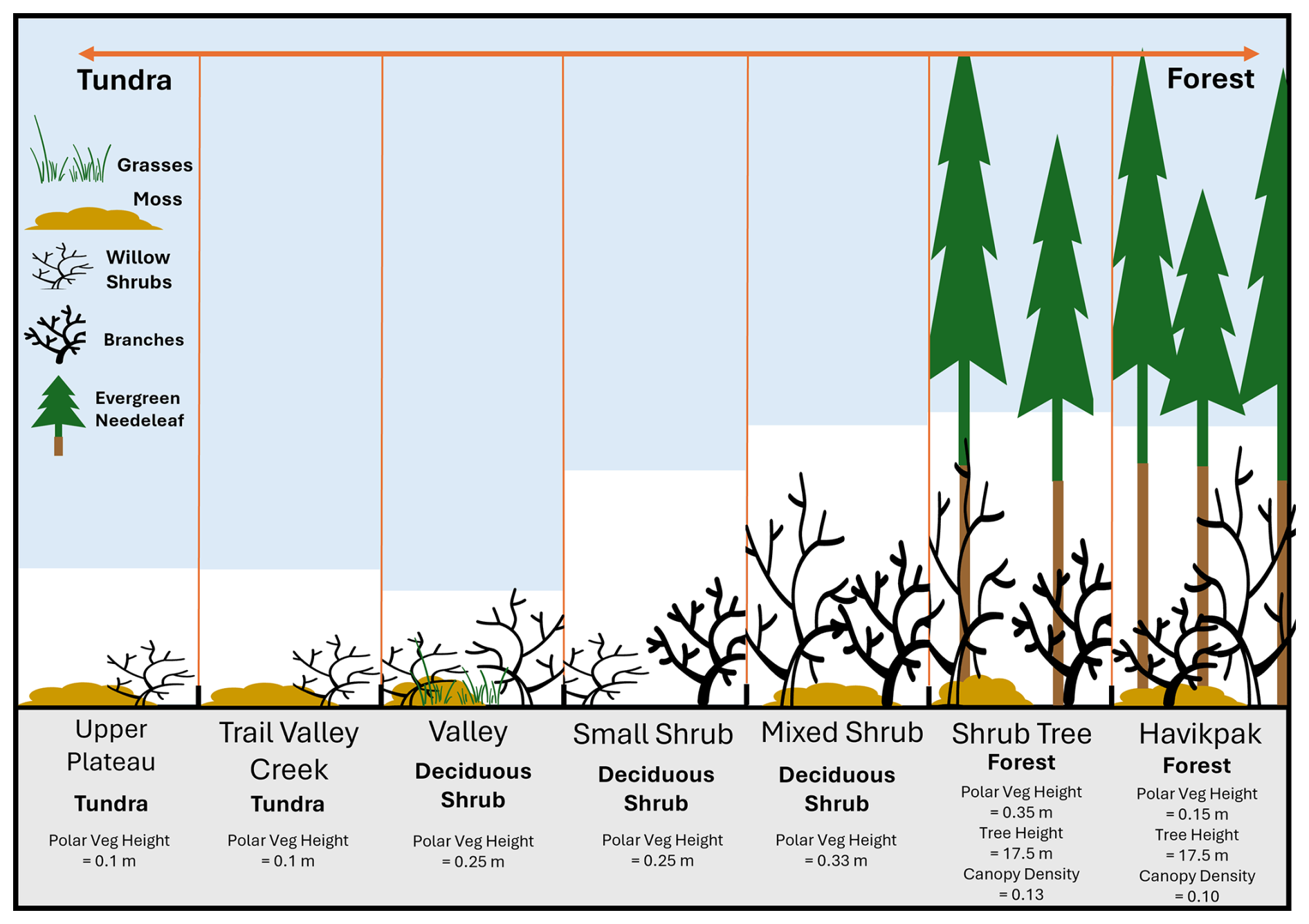 Figure 1Schematic showing the variation in vegetation and relative snow depth (white bars) across a 40 km transect of the Northwest Territories, Canada (Fig. 2). SVS2-Crocus model parameters of vegetation type, polar vegetation height (see Sect. 3.2.1 for definition), tree height and canopy density are also displayed for each site.