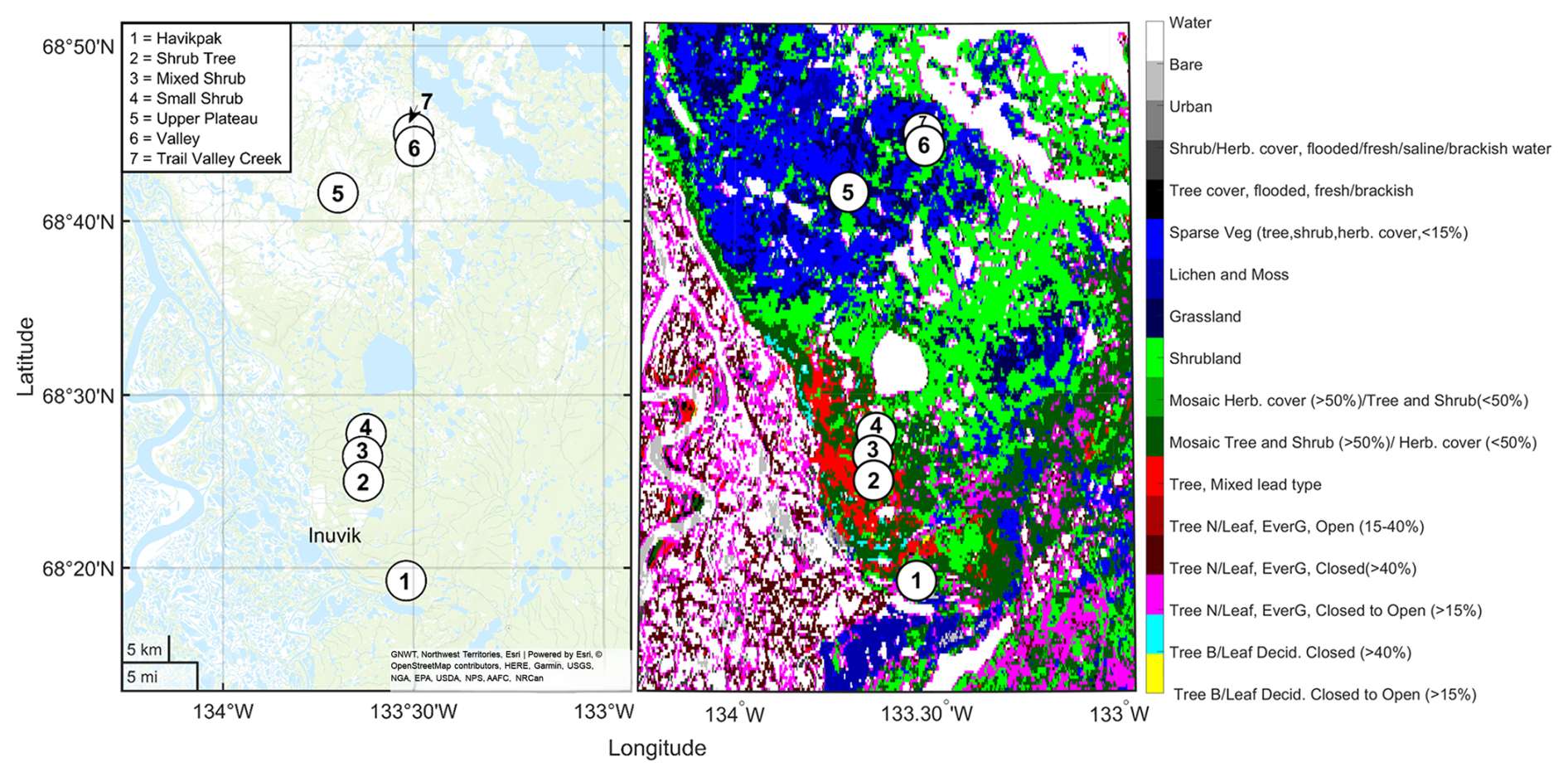 Figure 2Map of the study domain showing (left) the location of the 7 sites across the 40 km transect of the Northwest Territories, Canada and (right) vegetation type at each site derived from the ESA CC1 LC global map (European Space Agency Climate Change Initiative Land Cover; http://esa-landcover-cci.org, last access: 14 March 2025).