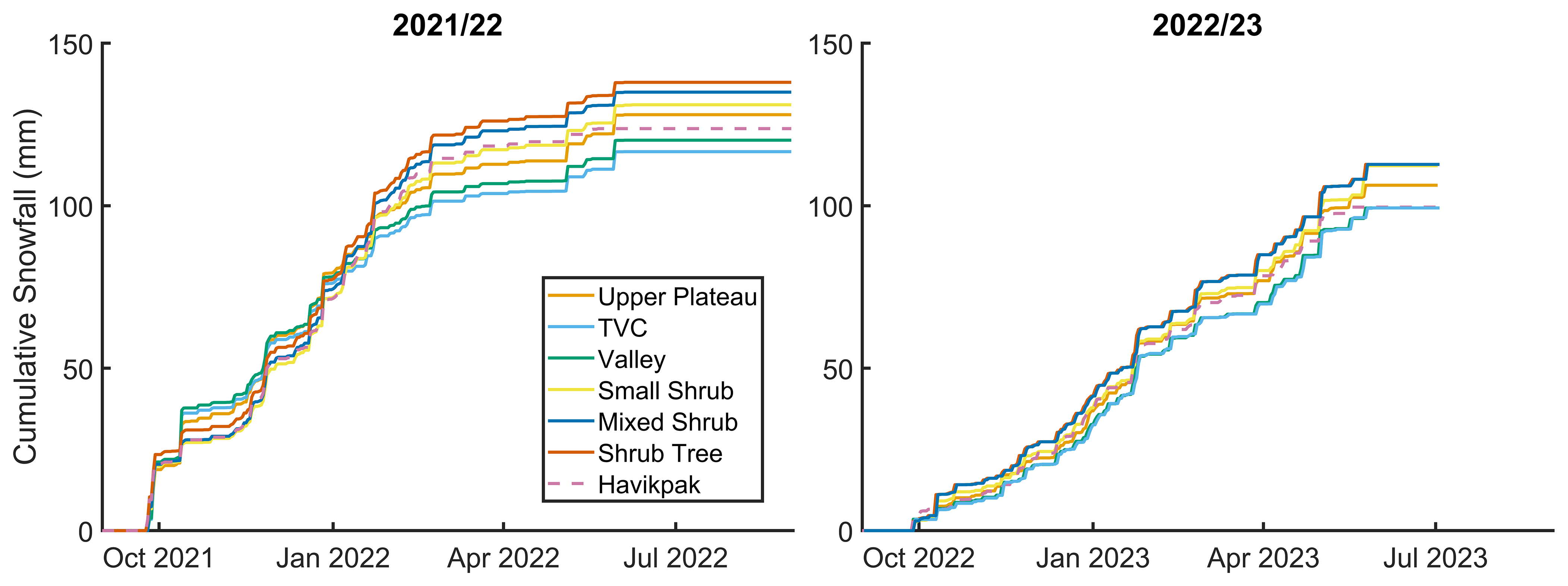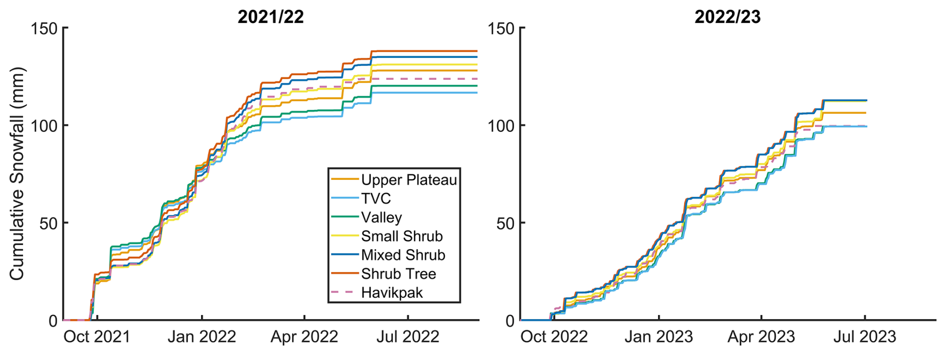 Measured snow depth and SWE increased southward across the forest-tundra ecotone during the winters of 2021/22 and 2022/23. The shallowest snow depths were found at Trail Valley Creek (0.41 m; 2022) and Valley (0.4 m; 2023) and the deepest at Shrub Tree (0.72 m; 2022 and 0.69 m; 2023). Valley (95 kg m−2; 2022) and Small Shrub (84 kg m−2; 2022) exhibited the lowest measured SWE whereas Shrub Tree consistently exhibited the highest measured SWE across both years (162 kg m−2; 2022 and 153 kg m−2; 2023). Measured bulk density decreased southward across the ecotone with highest bulk density values at Trail Valley Creek (293 kg m−3; 2022 and 334 kg m−3; 2023) and lowest at Havikpak (191 kg m−3; 2022) and Mixed Shrub (198 kg m−3; 2023). Deeper snow depths and higher SWE were found in 2022 than 2023 for all sites due to higher snowfall early in the snow season in 2022 (Fig. 3) whereas bulk density was higher in 2023 than 2022.