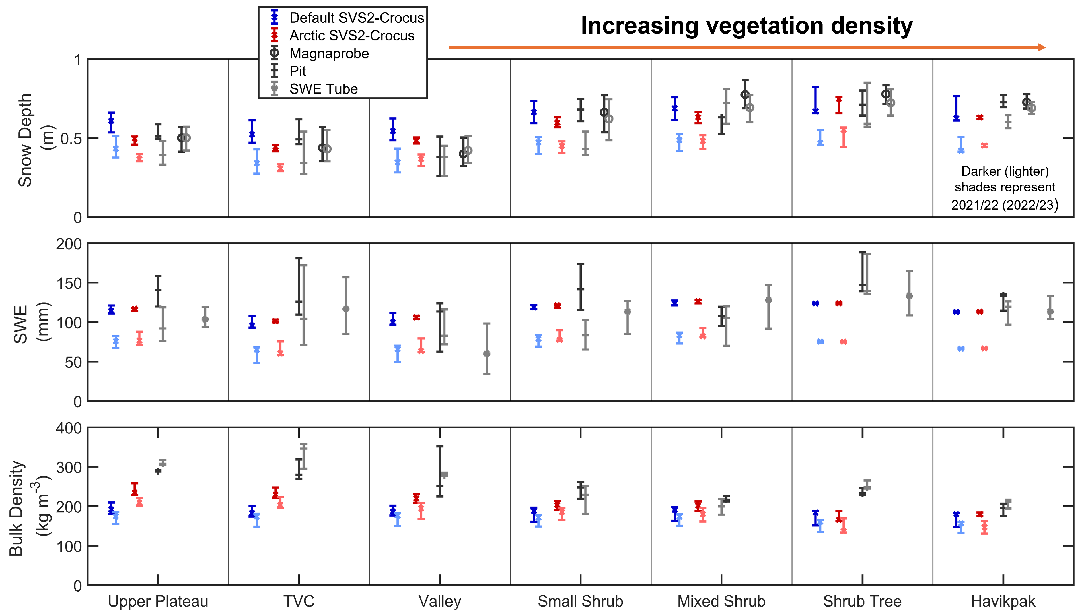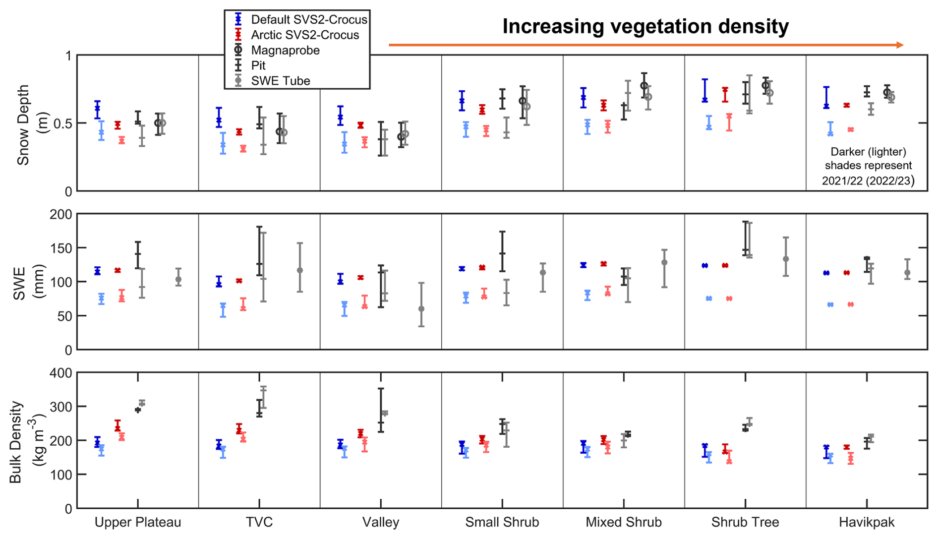 Figure 4Distribution (median, interquartile range) of simulated and measured snow depth (m), SWE (kg m−2) and bulk density (kg m−3) at each site for the 2021/22 and 2022/23 winter. Lighter shades of each colour represent the winter of 2022/23. Each distribution represents simulated and measured snow properties at the time of snow pit measurements. Vegetation type for each site is described in Fig. 1.