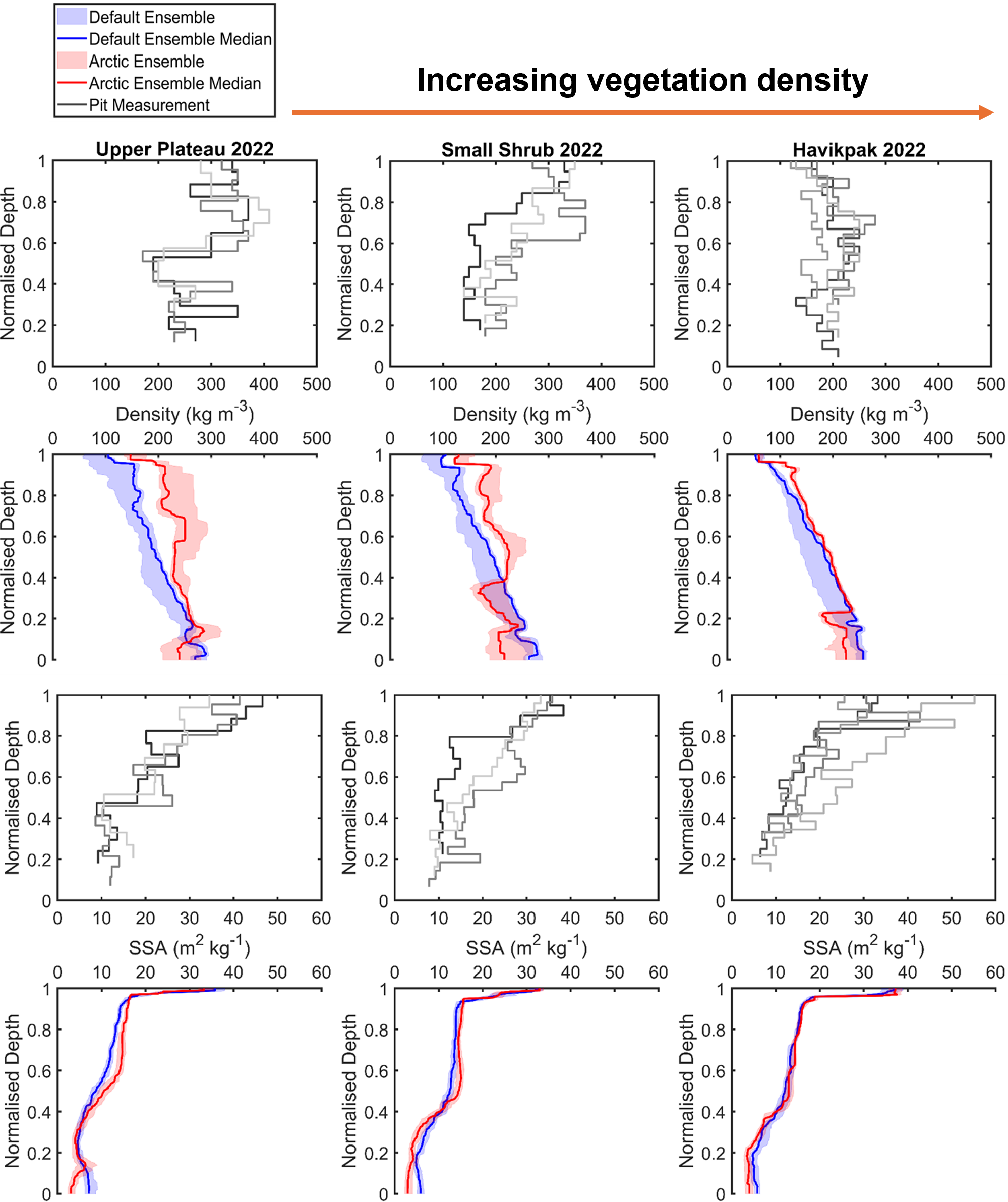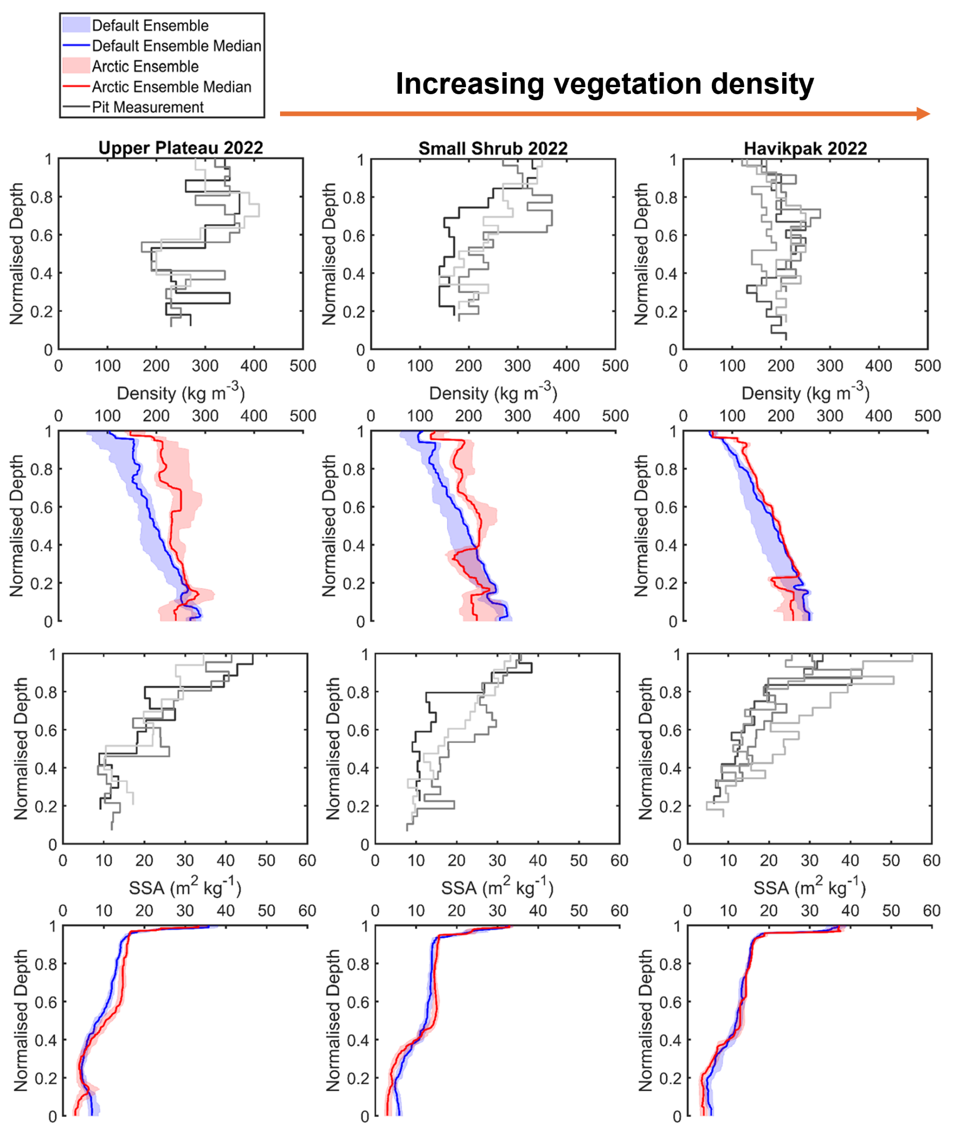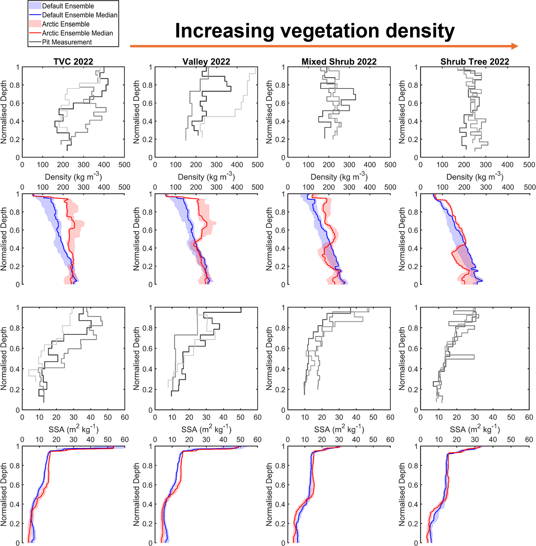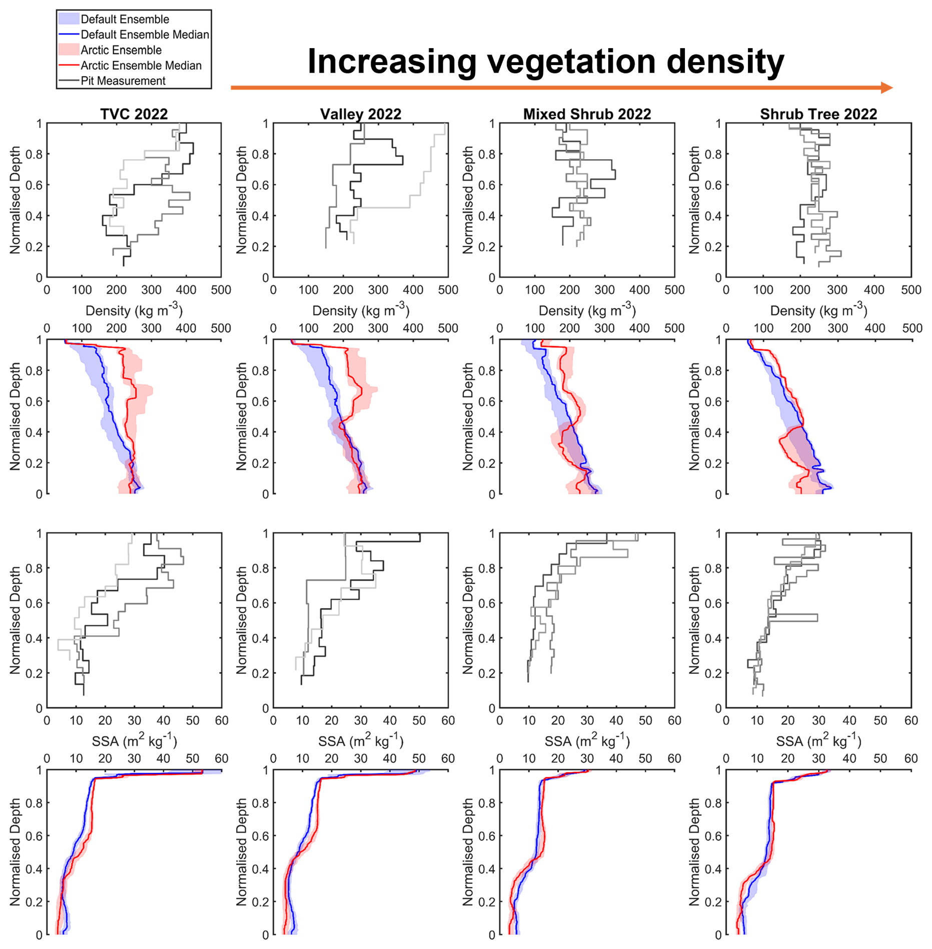 Figure B1Comparison of measured and simulated vertical profiles of density (kg m−3, median, interquartile range) and SSA (m2 kg−1, median, interquartile range) by default and Arctic SVS2-Crocus from the March 2022 winter field campaign. Black and grey lines indicate different pit profiles. Vegetation type for each site is described in Fig. 1.