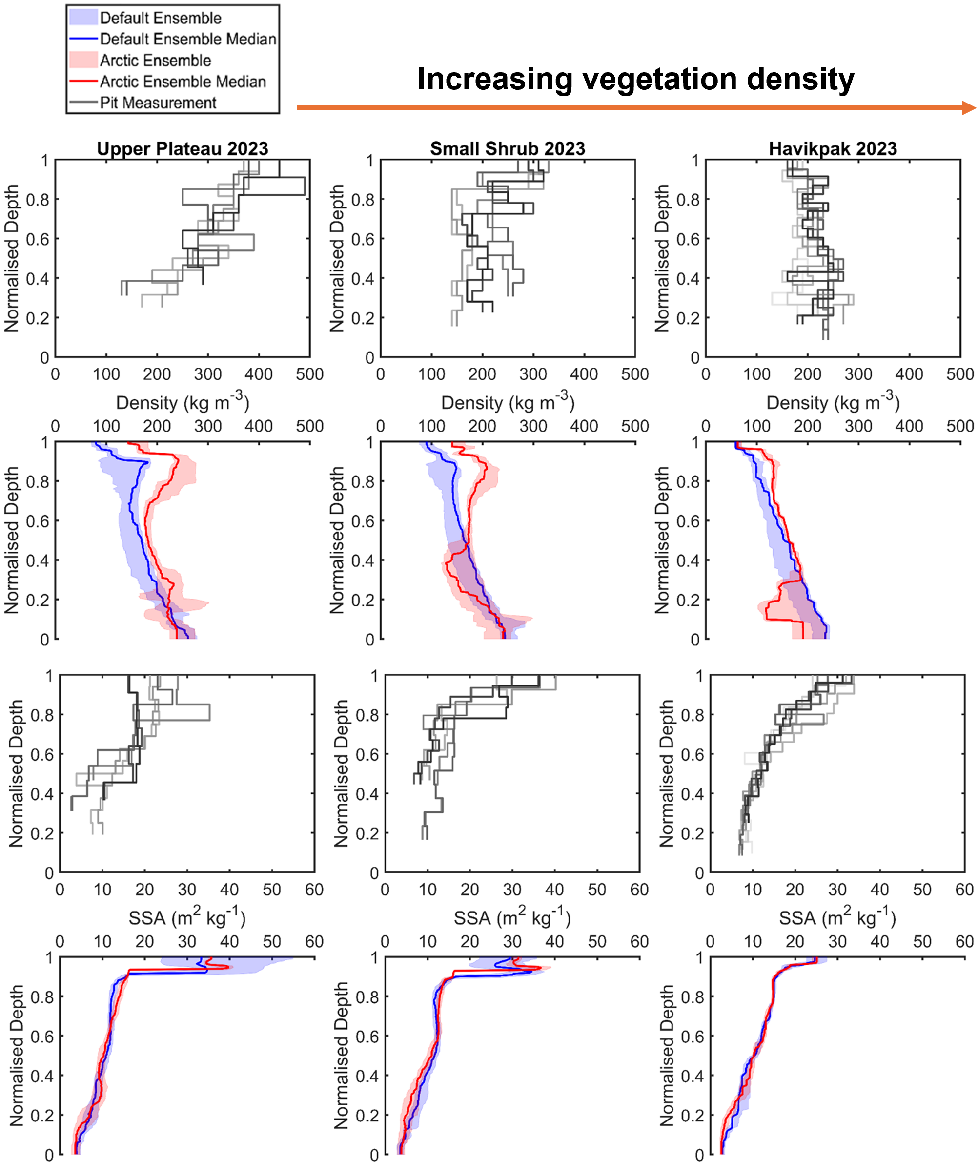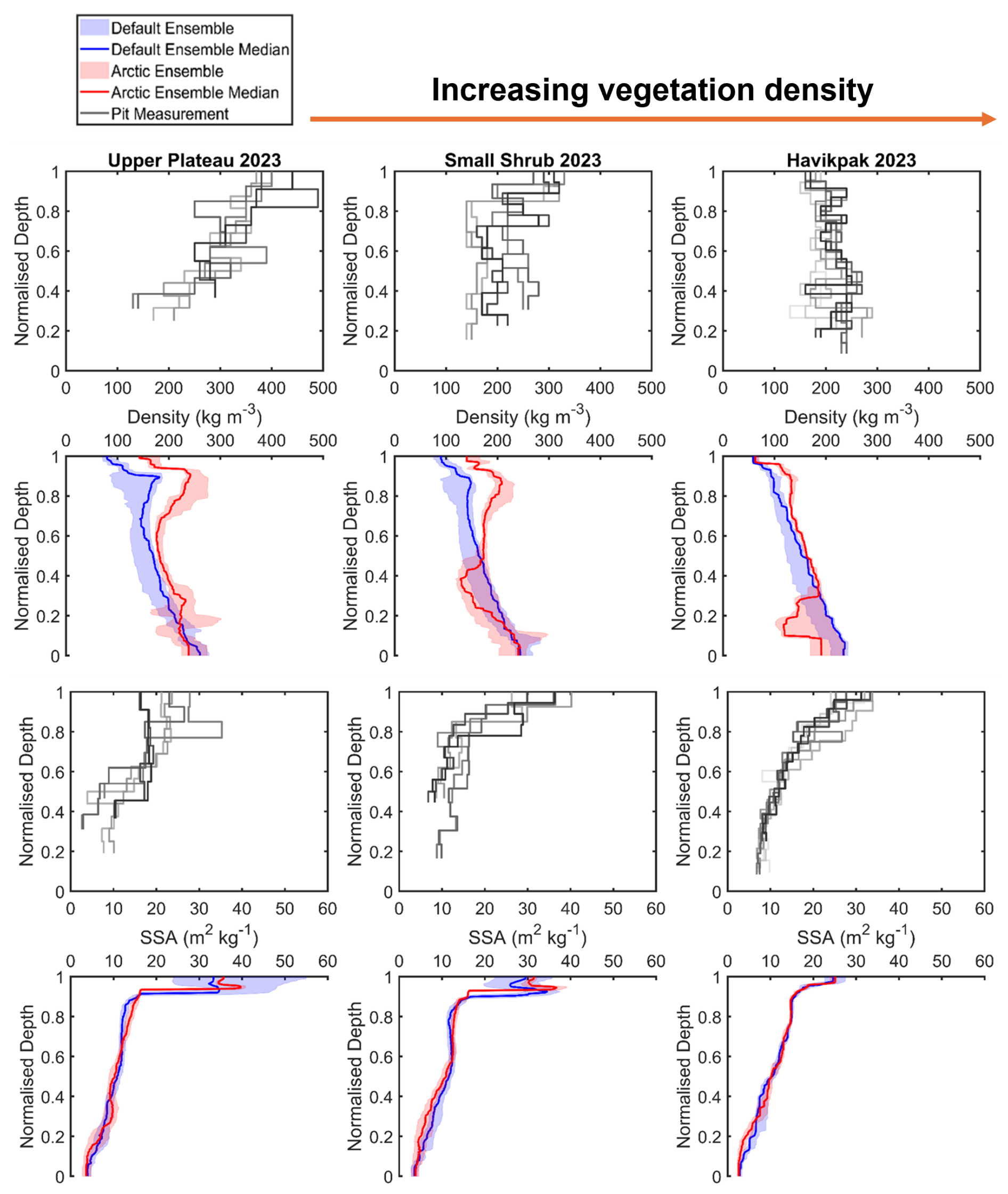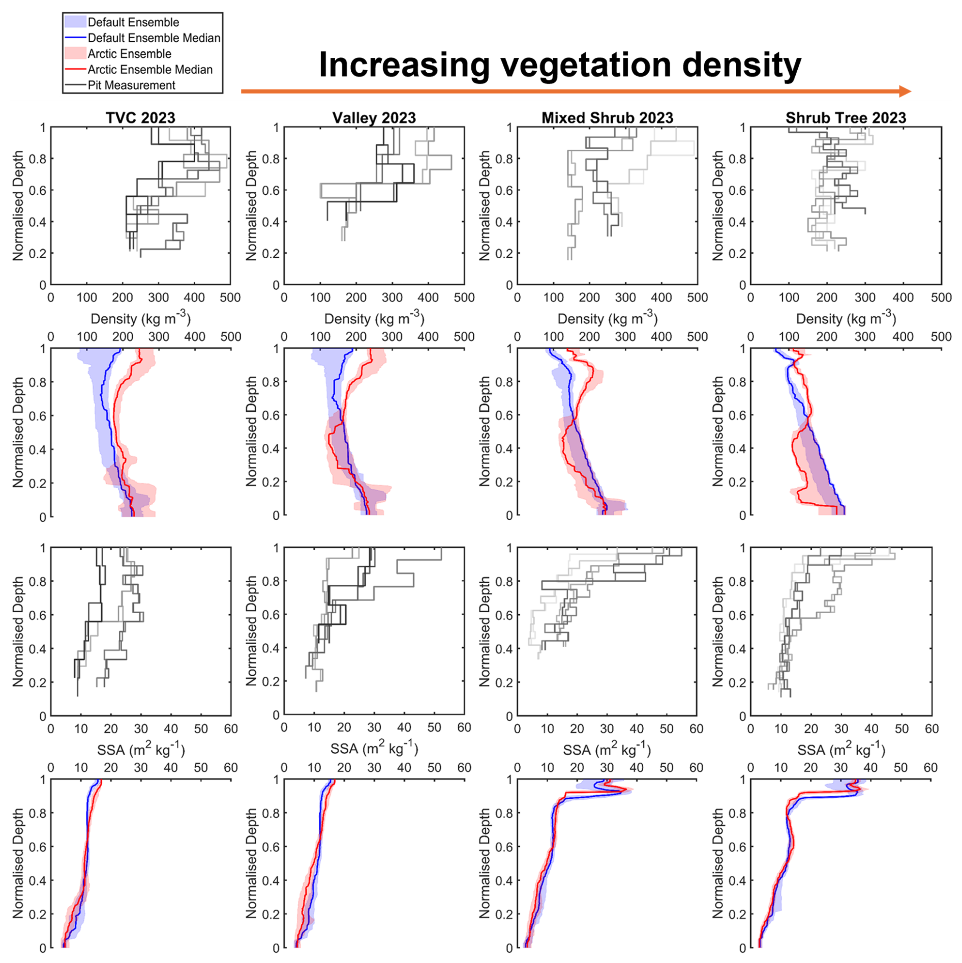 Figure 6Comparison of measured and simulated vertical profiles of density (kg m−3, median, interquartile range) and SSA (m2 kg−1, median, interquartile range) by default and Arctic SVS2-Crocus from the March 2023 winter field campaign. Black and grey lines indicate different pit profiles. Vegetation type for each site is described in Fig. 1.