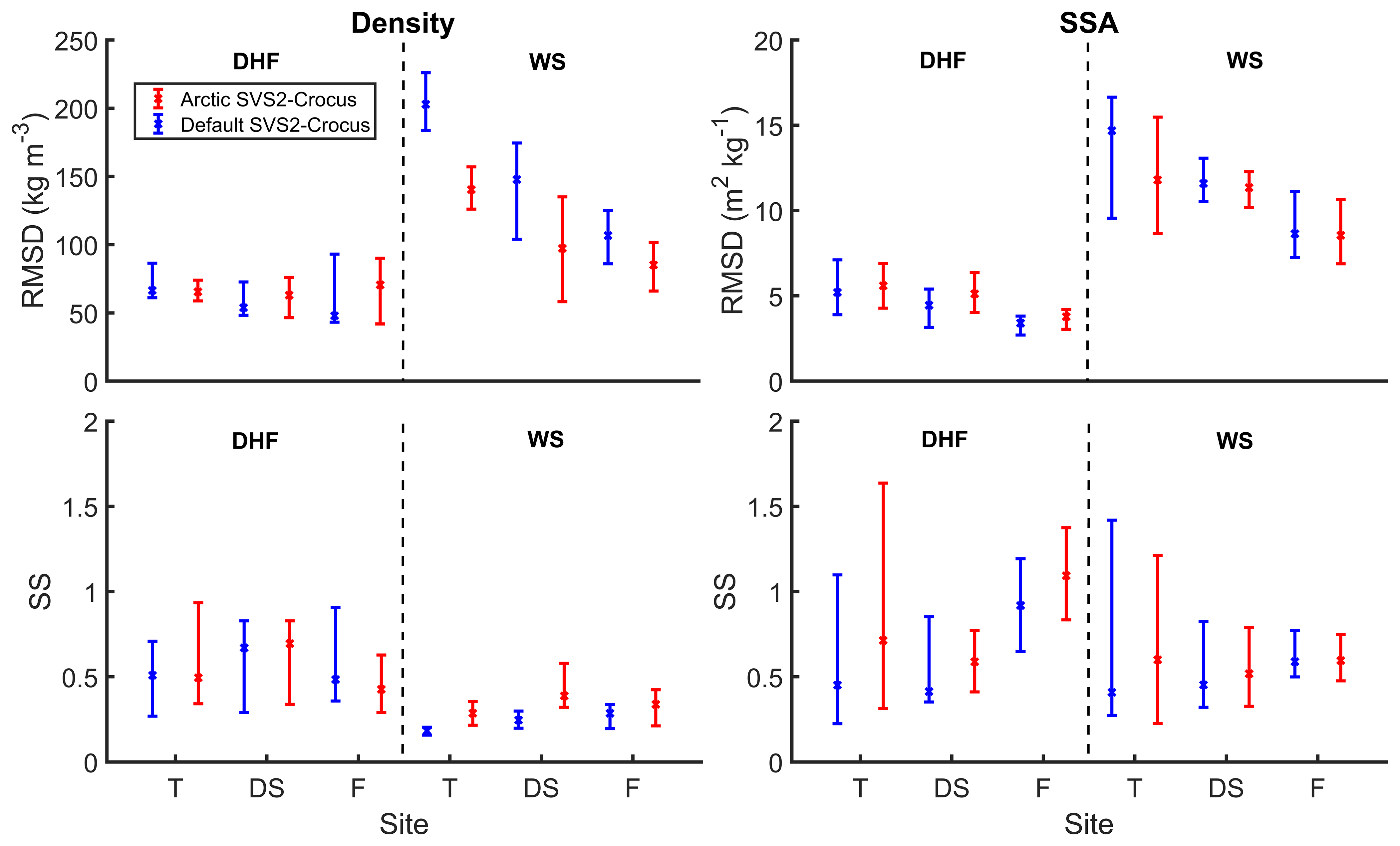 Figure 7RMSD and SS scores the simulation of density (kg m−3) and SSA (m2 kg−1) by default and Arctic SVS2-Crocus for different vegetation types (T: Tundra; DS: Deciduous Shrubs: F: Forest – described in Sect. 3.2.1) for the 2021/22 and 2022/23 field campaigns. Scores are separated for depth hoar (DHF) and wind slab (WS).
