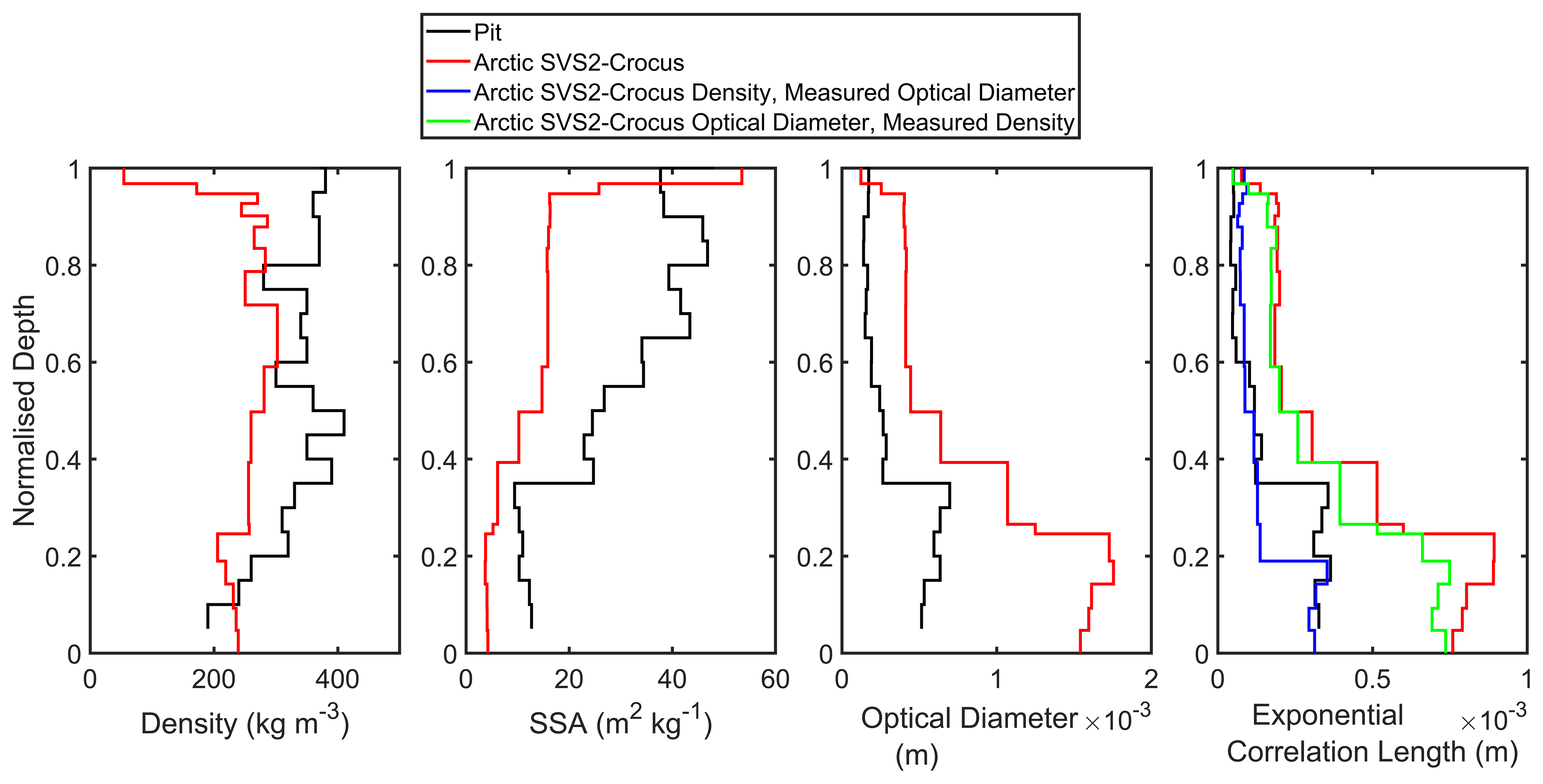 Much previous work illustrating the need for Arctic specific parameterisations for the simulation of snowpack properties has focused on improving the density profile, supporting simulations of soil temperatures and permafrost modelling (Royer et al., 2021b; Lackner et al., 2022; Barrere et al., 2017; Gouttevin et al., 2018). Uncertainties in simulations of SSA highlighted within this study now push the focus towards the importance of improving parameterisations of snow metamorphism for SWE retrieval (Derksen et al., 2021; Tsang et al., 2022) and data assimilation (Larue et al., 2018). Although IceCube may overestimate measurements of SSA for depth hoar grains (Martin and Schneebeli, 2023), simulated SSA by both default and Arctic SVS2-Crocus lie outside the range of typical measurements found within the Arctic (Montpetit et al., 2024; Woolley et al., 2024; Rutter et al., 2019). Uncertainties in the simulation of SSA by SVS2-Crocus could stem from the growth of depth hoar in the metamorphism scheme (Marbouty, 1980) or the optical diameter (Carmagnola et al., 2014; Libois et al., 2014; Morin et al., 2013). The parameterisation of Marbouty (1980) is not well suited to simulate the optical size of depth hoar grains and should be revised for Arctic snowpacks with strong temperature gradients. Tundra sites, Trail Valley Creek and Valley, experience the largest underestimation in SSA suggesting the shallow snowpacks (mean Trail Valley Creek SD: 0.37 m; mean Valley SD: 0.41 m) generate strong temperature gradients and further increase the rate of metamorphism (Wang and Baker, 2014).