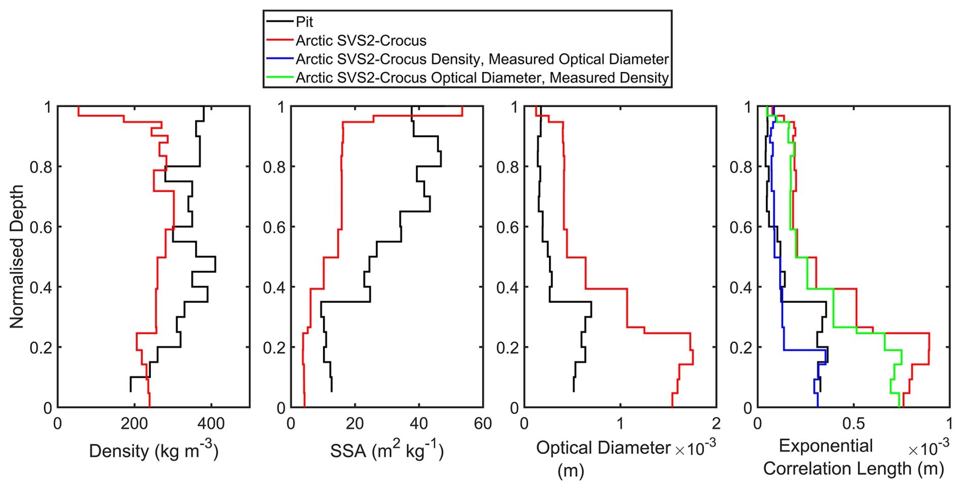 The exponential microstructure model, used within SMRT to compute the scattering coefficient, characterizes snow microstructure using the exponential correlation length which can be derived from SSA and density (Eq. 1; Picard et al., 2018). As Arctic parameterisations work to modify both SSA and density and since Ku-band frequency is highly sensitive to the snow grain size (Lemmetyinen et al., 2014), we investigate the impact of SSA and density on (a) the exponential correlation length (Fig. 8) and (b) the resulting snow backscatter (Fig. 9). Small errors in simulated basal SSA, which is underestimated by both default and Arctic SVS2-Crocus result in large errors in the optical diameter and in the exponential correlation length (Fig. 8). Low basal SSA values result in a correlation length that is too long (0.6 × 10−3–0.8 × 10−3 m) for the base of the snowpack in comparison to measurements (0.2 × 10−3 m). Errors in the simulation of surface layer SSA result in smaller errors in the exponential correlation length for the surface of the snowpack (Fig. 8). By substituting small simulated basal SSA values with larger snow pit measurements of SSA, the simulated exponential correlation length is shorter (0.2 × 10−3–0.3 × 10−3 m).