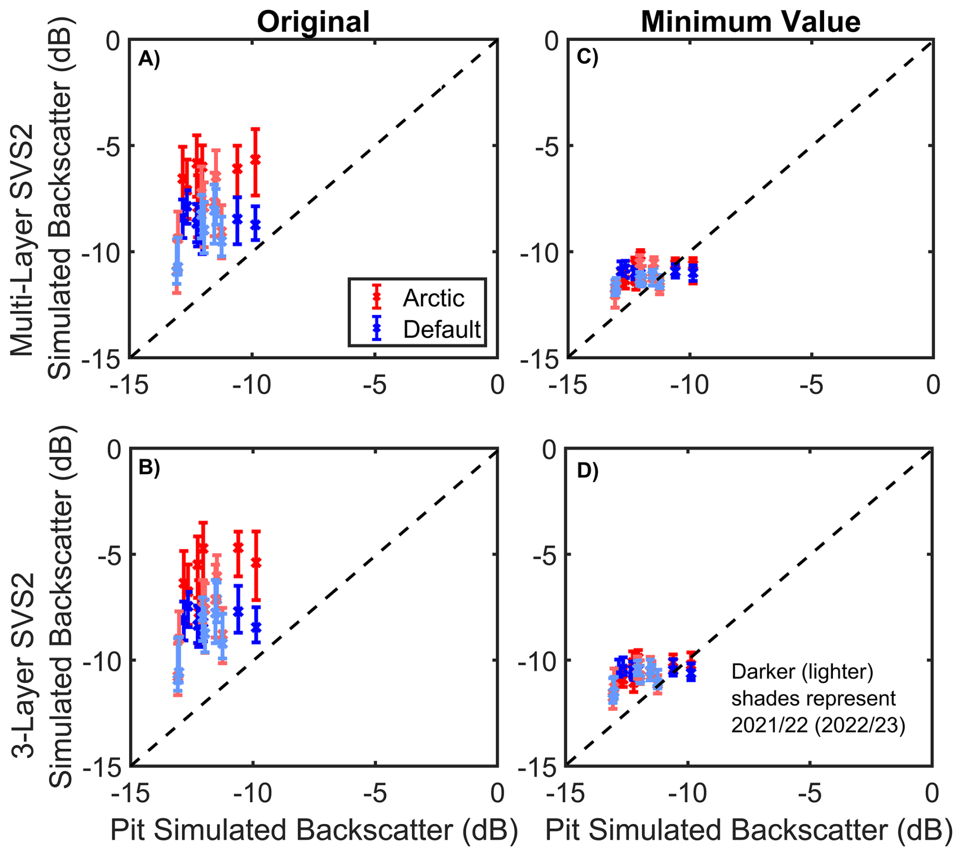 Figure 9Comparison between pit simulated backscatter and SVS2-Crocus simulated backscatter for a multi-layer (A, “Original”) and 3-layer (B, “Original”) radar equivalent snowpack (interquartile range, median) for the 2021/22 and 2022/23 winter seasons at Ku-band frequency (13.5 GHz). (C, D) Comparison with a minimum SSA of 8.7 m2 kg−1 (“Minimum Value”; maximum optical diameter equivalent 0.75 mm).