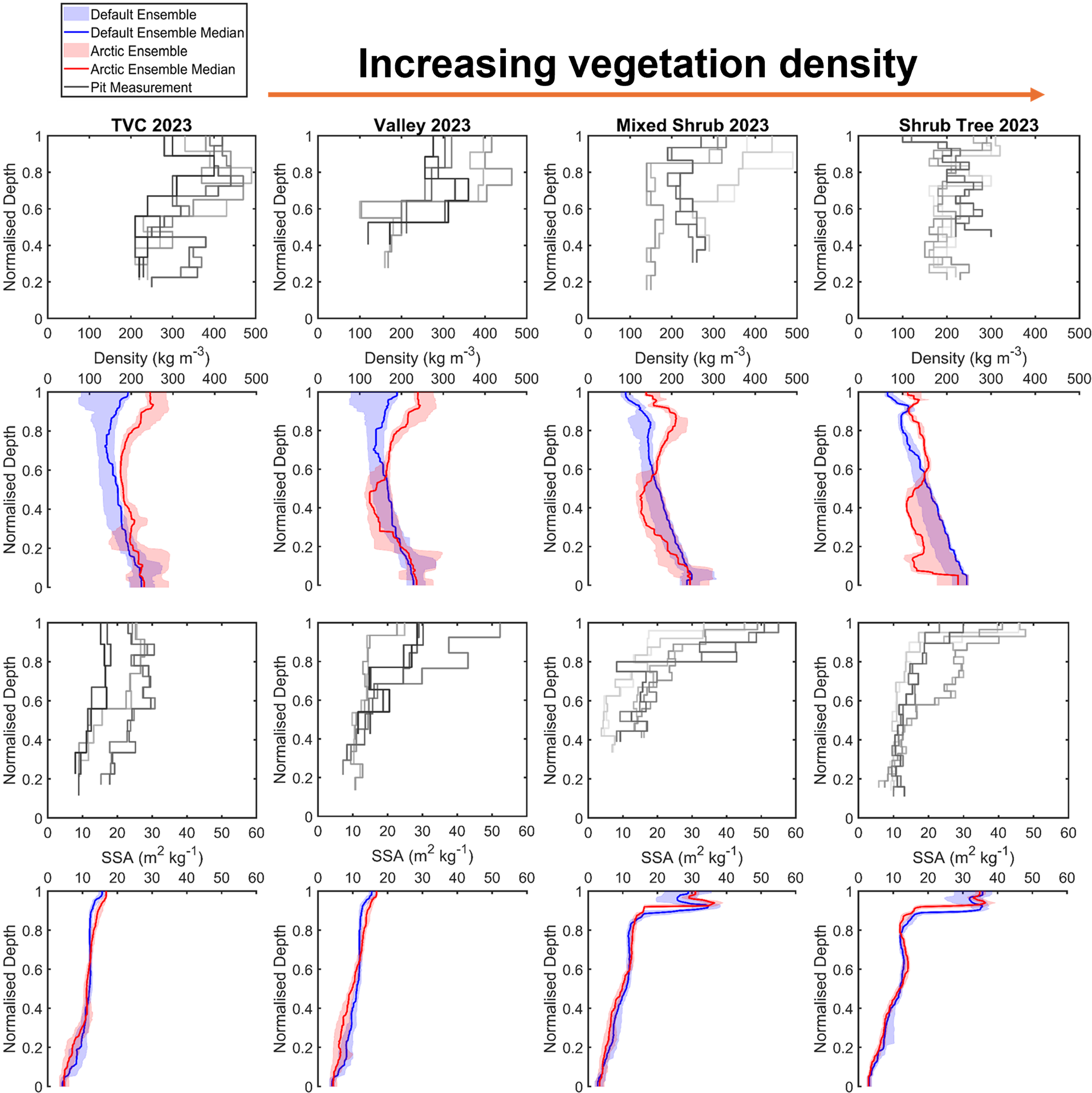 Figure B2Comparison of measured and simulated vertical profiles of density (kg m−3, median, interquartile range) and SSA (m2 kg−1, median, interquartile range) by default and Arctic SVS2-Crocus from the March 2023 winter field campaign. Black and grey lines indicate different pit profiles. Vegetation type for each site is described in Fig. 1.