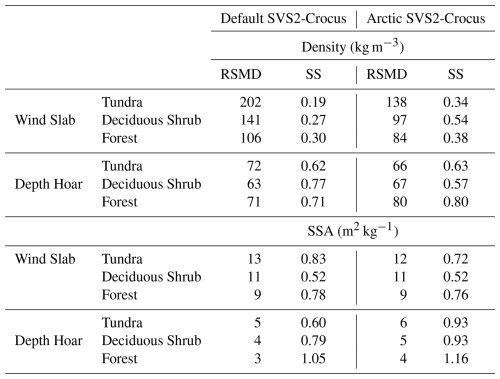 Table 1Mean RMSD and SS scores for measured and simulated snow density (kg m−3) and SSA (m2 kg−1) for combined 2021/22 and 2022/23 snow seasons. Statistics are presented for each layer (depth hoar and wind slab) and each vegetation type, as classified in Fig. 1: Tundra (Upper Plateau, Trail Valley Creek), Deciduous Shrub (Valley, Small Shrub, Mixed Shrub) and Forest (Shrub Tree and Havikpak).