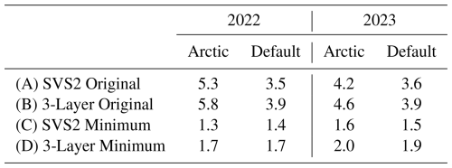 Wind effect modifications applied to Arctic SVS2-Crocus lead to higher simulated bulk densities and shallower snow depths at all sites when compared to default SVS2-Crocus (Fig. 4). Arctic SVS2-Crocus simulated bulk density was highest at Upper Plateau (2022: 241 kg m−3) and Trail Valley Creek (2023: 234 kg m−3) due to high wind speeds resulting from exposed topography whereas default SVS2-Crocus simulated lowest bulk densities at Havikpak (2022: 171 kg m−3; 2023: 150 kg m−3) due to canopy cover reducing wind speed and compaction processes. Reduced variability in snow depth simulated by Arctic SVS2-Crocus is due to the inclusion of wind-induced compaction, which increases snowpack density and produces snow depths more consistent with observations relative to the default configuration. As both default and Arctic SVS2-Crocus received identical precipitation forcing from the HRDPS, they simulate similar magnitudes of SWE (Fig. 4). Default and Arctic SVS2-Crocus show good agreement with measurements for the simulation of SWE at all sites in 2021/22 (Fig. 4; default RMSD range: 12–28 kg m−2; Arctic RMSD range: 8–25 kg m−2). However, SWE is underestimated by both ensembles at Trail Valley Creek (default RMSD: 51 kg m−2; Arctic RMSD: 46 kg m−2), Shrub Tree (default and Arctic RMSD: 61 kg m−2) and Havikpak (default RMSD: 50 kg m−2; Arctic RMSD: 50 kg m−2) in 2022/23. The differences in snow depth simulated by default and Arctic SVS2-Crocus therefore result from the opposing trends in bulk density (Fig. 4).