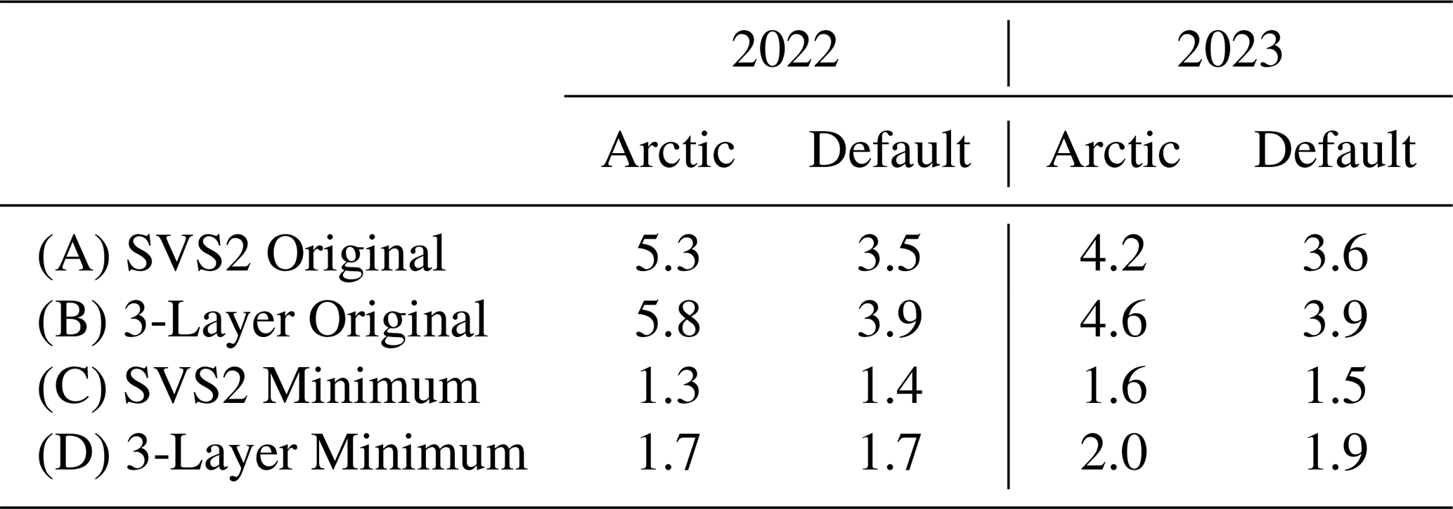 A simulated radar-equivalent snowpack is able to replicate the scattering behaviour of the multi-layer snowpack, resulting in an RMSD below 1 dB (Table 2) at all sites except for Shrub Tree (RMSD: 1.32 dB) and Havikpak (RMSD: 1.30 dB) in 2022 where snowpacks are deeper and more complex than in 2023 (Fig. 4). The overestimation in simulated backscatter when compared to snow pit simulated backscatter is consistent between both multi-layer (Table 2: A) and 3-layer simulations (Table 2: B). Following the pattern of the multi-layer snowpack, implementing a minimum SSA values reduce the RMSD at all sites when using a radar-equivalent snowpack by 54 % (default SVS2-Crocus) and 65 % (Arctic SVS2-Crocus) for 2021/22 and 2022/23. The computation time in SMRT simulations was reduced by 60 % by simplifying the multi-layer snowpack (∼ 20 layers) to a radar equivalent snowpack (3 layers). The radar-equivalent snowpack can therefore increase the computational efficiency for SWE retrieval algorithms without altering the scattering behaviour.