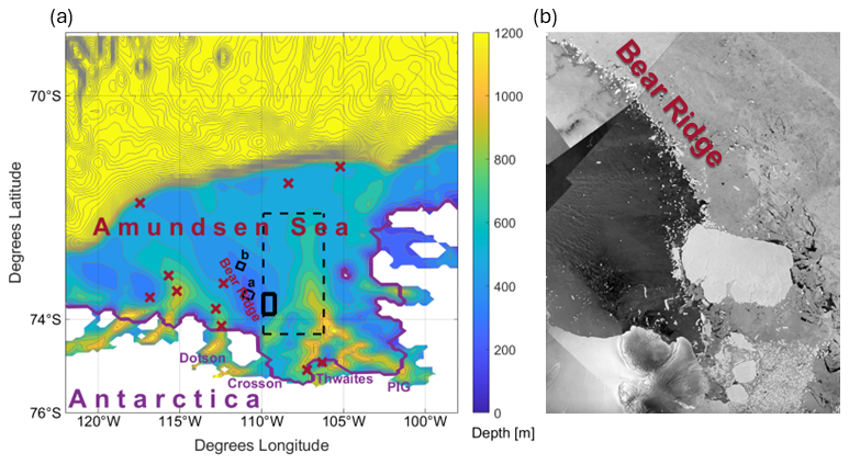 Figure 1(a) Amundsen Sea and Bear Ridge topography [m] based on the BedMachine Antarctica dataset (Morlighem et al., 2020) and re-gridded on the model configuration grid. Gray contours are spaced 80 m apart. Thin solid black contours delimit the bounds of panels (a) and (b) in Fig. 2, indicating the sites of observed iceberg scours in Sect. 2.1 with labels matching the boxes in panels (a) and (b) in Fig. 2. Dark red crosses mark the locations of sediment samples analysed in Sect. 2.2. The thick purple line shows the ice shelf edge, with major ice shelves labelled: Dotson, Crosson, Thwaites, and Pine Island Glacier (PIG). Thick solid (thin dashed) black lines show the boundaries of the panels where icebergs are released in the SHORT (LONG) simulations. (b) Copernicus Sentinel-1 SAR (synthetic aperture radar) image from 12 February 2022 over Bear Ridge with white shades indicating the presence of icebergs and sea-ice.