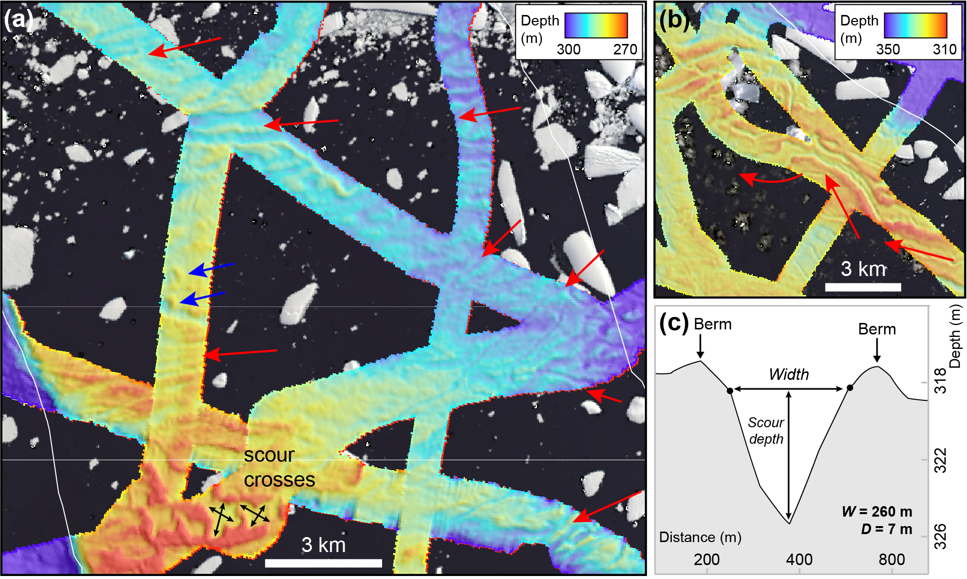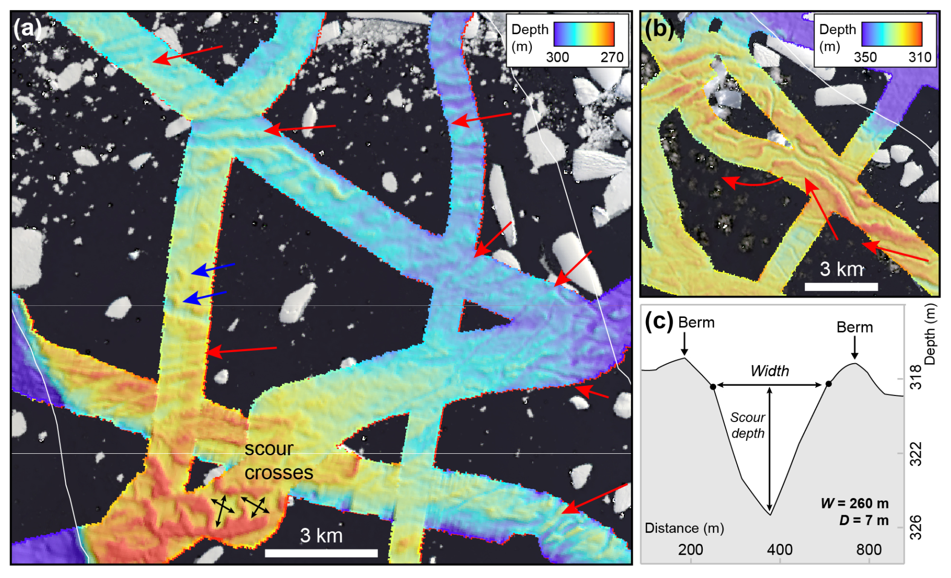 As they drift, icebergs may run into topographic obstacles or plough into seafloor sediment, a phenomenon that has been the subject of scientific inquiry as far back as the 19th century, when Charles Darwin published a short communication on iceberg interaction with the ocean bottom (Darwin, 1855). More recently, a number of studies on iceberg scouring have had a focus on protecting underwater infrastructure (e.g., Chari, 1975; Chari et al., 1980; Lopez et al., 1981). Other literature explores past iceberg scours in order to infer paleoclimatic changes in the North Atlantic (Hill and Condron, 2014) and the Southern Ocean (Starr et al., 2021).