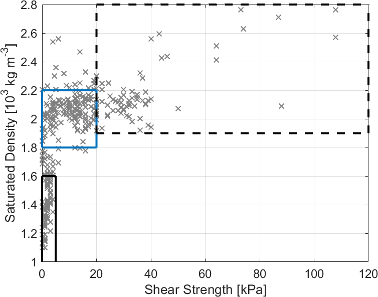 Figure 3Observed sediment properties for selected cores from the Amundsen Sea: the uppermost sediments consist of soft, water-rich muds (solid black box); coarser-grained stratified to structureless diamictons and “soft” deformation tills (solid blue box); stiffer tills and/or denser subglacial diamictons (dashed black box). The soft/stiff till boundary follows Reinardy et al. (2009). Values outside the boxes reflect other sediment types such as iceberg diamictons, glaciogenic debris flows etc.