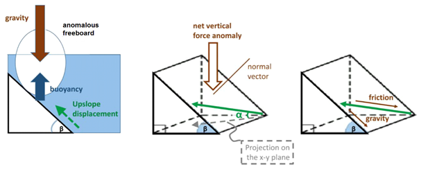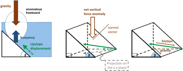 Lifting the iceberg out of floatation means that a portion of the iceberg's weight is no longer supported by the buoyancy of ice relative to seawater. The vertical displacement yields a deficit of ρwaterHfreeboard anom. in the mass of seawater displaced by the berg per unit area, and a corresponding net downwards gravitational force. Dividing this force by the berg mass per unit area, we arrive at an acceleration whose projection down the sloping topography is