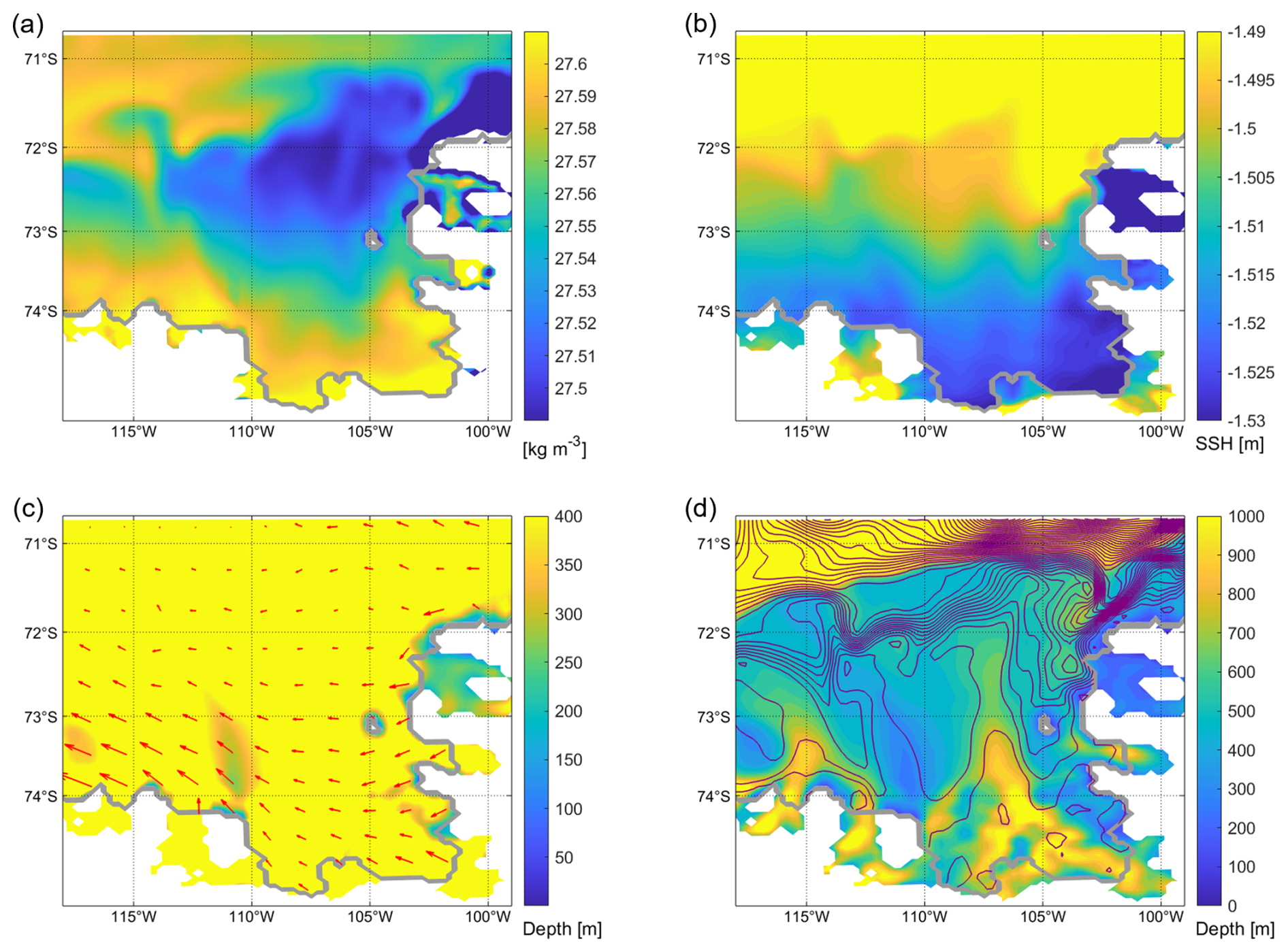 Figure 5Climatology (1979 through 1982) of the Amundsen Sea configuration. (a) potential density [kg m−3] referenced to the surface, vertically averaged over the top 310 m with shallower regions masked; (b) sea-surface height [m]; (c) wind stress vectors [N m−2]; (d) barotropic streamfunction contours [0.1 Sv intervals]. The bottom depth [m] is superimposed in panels (c) and (d). The depth range in panel (c) chosen to highlight the location of the shallow Bear Ridge and a wider depth range in panel (d) to highlight the alignment of streamlines and topography. The ice shelf edge is marked by the thick gray line.