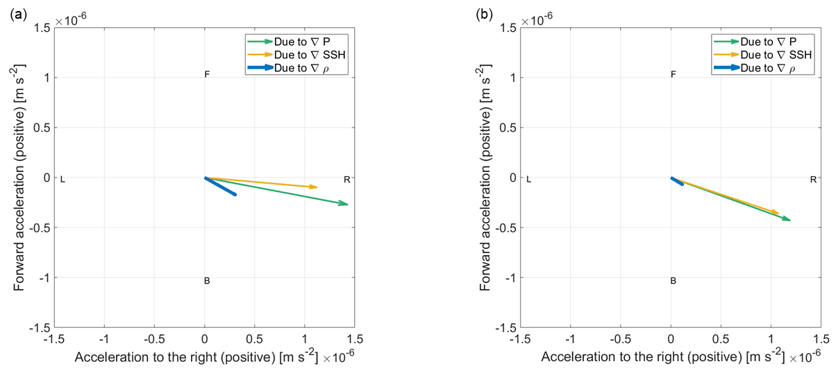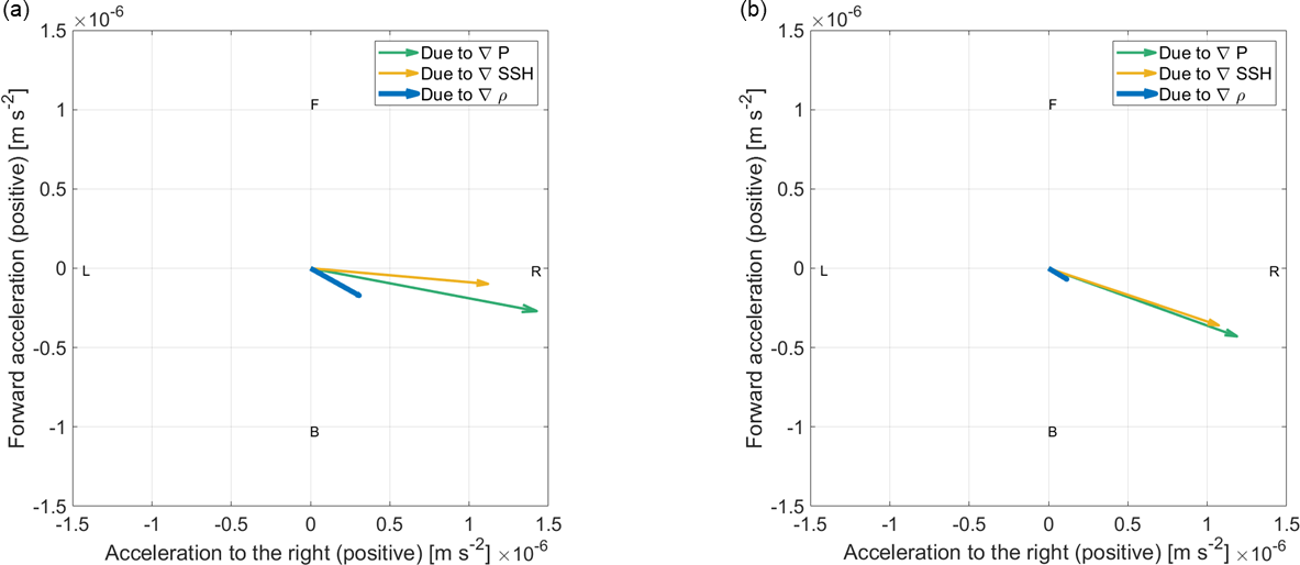 where 〈ρ′(z)〉 = is the density anomaly, relative to the reference Boussinesq density ρ0, averaged over the overlying water column, g is the magnitude of the acceleration due to gravity, and h(z) is the water-column thickness above level z. Under the Boussinesq approximation, the contribution of the second term on the RHS may be neglected. In addition to large-scale dynamical features, tides also contribute to SSH gradients, while SSH anomalies are considered a major driver of iceberg motion, especially for weakly-grounded icebergs (Brown et al., 2017).