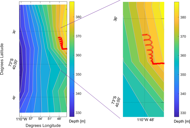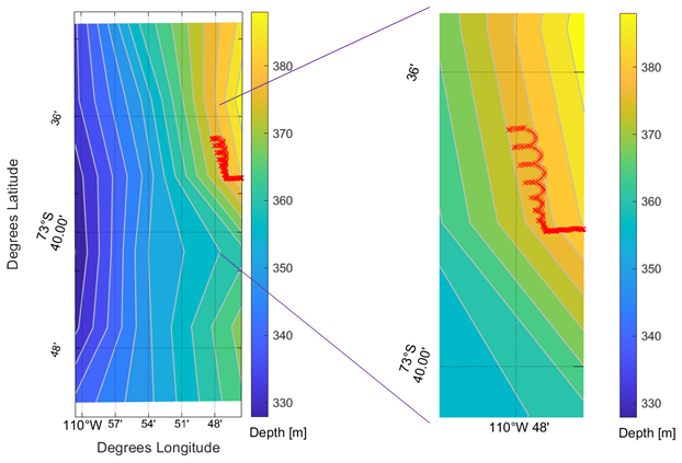 Iceberg scours on Bear Ridge exhibit a variety of forms (Fig. 2). Many incisions consist of single v- to u-shaped curvilinear depressions with shallow berms on either side; incision depths range from 2.5–15 m, widths are 90–360 m, and berm heights are typically 1–3 m (Fig. 2c). The orientation of these scours is typically E-W or SE-NW (average orientation is 0.94°) and is thus consistent with iceberg transport from the Pine Island and Thwaites glacier fronts with the coastal current. However, the cross sections of some scours can change direction and vary along their length from a single v-shaped to wider u- or w-shaped, the latter indicating that the geometry of the iceberg base has varied as the iceberg was dragged through the sediment (consistent with either keel break-off or iceberg rotation). Tabular iceberg keels also have v-shaped protrusions along the rough surface of their bases. Occasionally, a large tabular iceberg can even plough multiple parallel scours. Some scours also terminate abruptly in rounded depressions, encircled by a shallow berm. Such iceberg grounding pits or iceberg plough ridges indicate where seafloor scouring terminated (e.g., Jakobsson et al., 2011). Most often there are no other incisions on the seafloor that cross-cut the plough ridges, suggesting that the icebergs either lifted-off from the seafloor once enough melting had occurred or perhaps capsized (rotated vertically due to an unstable height : width ratio; e.g., Bass, 1980 and Ruffman, 2005) allowing them to float away freely without incising the seafloor further.