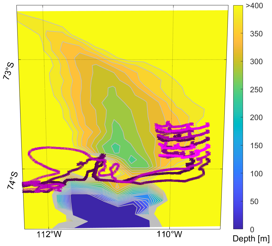 In order to understand the trajectories and behaviour of icebergs in the eastern Amundsen Sea, we first explore the wider climatic conditions, including the oceanic and atmospheric climatology and variability in the region. There is a relatively lower water column density to the east of the ridge compared to the water column over the ridge (Fig. 5a), but this is compensated by a positive zonal SSH gradient between 112 and 110° W (Fig. 5b), which in combination with the Coriolis force would drive icebergs southward near the Ridge (Fig. 5a). Overall, there is very little ocean transport across Bear Ridge although the prevailing winds are oriented north-westward across the ridge (Fig. 5c, d).