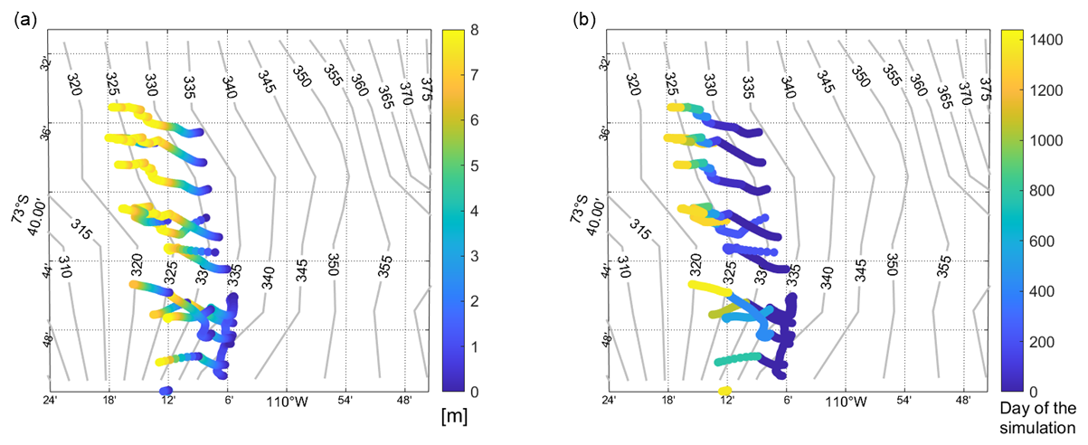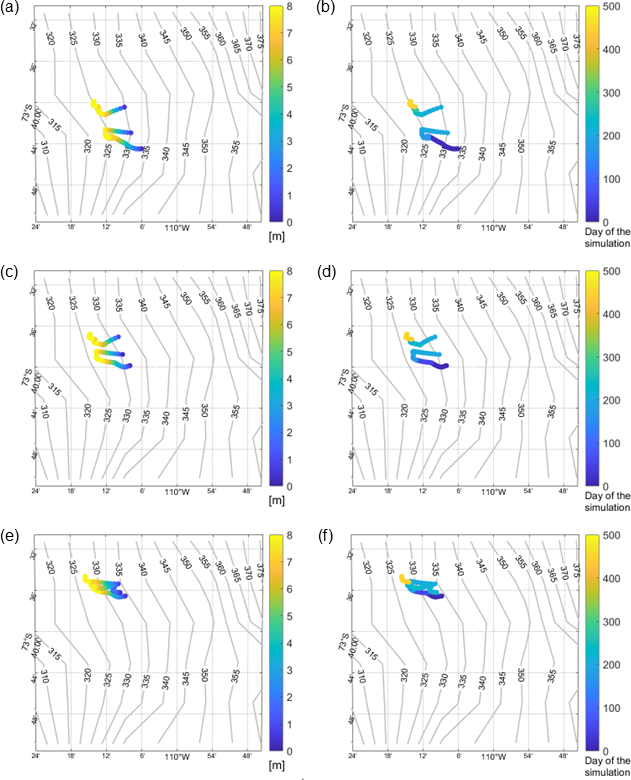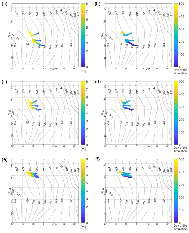 In this study we explore the results of two types of simulations, where each type of simulation is performed with each type of iceberg thickness. In the short simulations, labelled “SHORT” hereafter, we initially seed a total of 497 identical test icebergs one in each grid cell (∼ to ∼ ° in latitude × ∼ ° in longitude) in the region east of Bear Ridge enclosed by 109.9° and 106.2° W, 74.3° and 72.0° S (Fig. 1). While it is not realistic to expect hundreds of thick tabular icebergs to simultaneously occupy this region, our icebergs do not interact with each other or block sea-ice (while sea-ice does impact icebergs). In our SHORT simulations, even when icebergs melt, we do not allow any iceberg meltwater to be injected in the ocean, so as not to perturb the background conditions with each set of 497 icebergs. We run this simulation with a large ensemble of icebergs but only over the course of one full year spanning all seasons. Each of the grid boxes that we seed is a possible location where an iceberg may be found, and hence, we explore the behaviour of thick tabular icebergs when exposed to the local conditions. This large population allows us to analyze the statistics of iceberg dynamics while focusing specifically on the thick tabular icebergs that are most likely to exhibit a long residence time when grounding on Bear Ridge. We aim to explore the differences in the dynamical behaviour of icebergs of different sizes by comparing the THICK and MEDIUM populations. In order to preserve the large thicknesses and horizontal areas in the THICK iceberg population, we do not allow the latter to melt during a SHORT 1-year simulation.