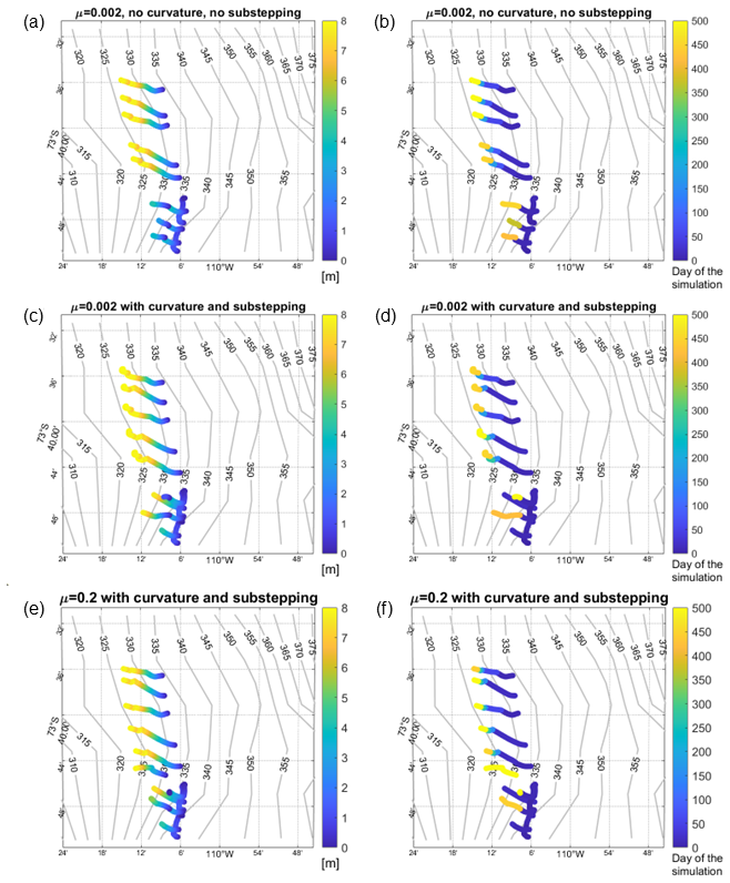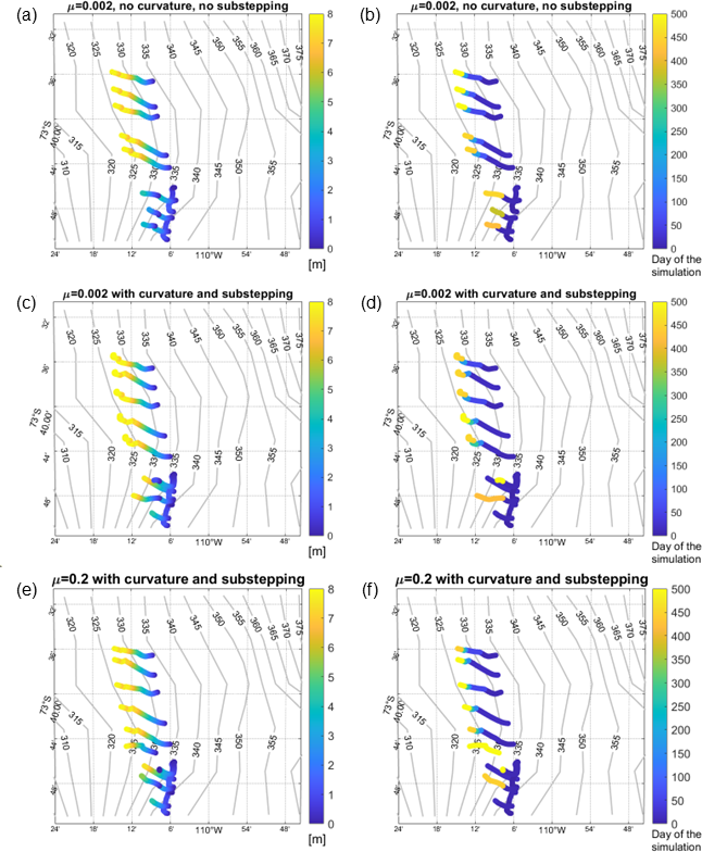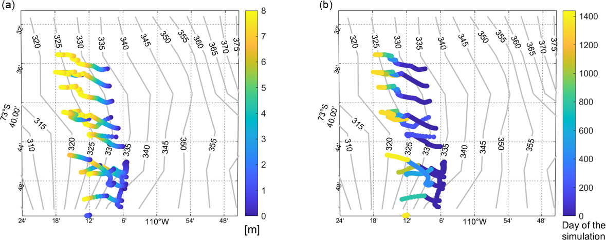 We also run longer simulations labelled “LONG”, which are extended farther in time over 4 years to enable a comparison between modelled and observed iceberg scours. We seed a much smaller subset of 14 identical icebergs in a narrower box, bounded by 109.9 and 109.2° W, 73.9 and 73.5° S (Fig. 1), on the eastern flank of Bear Ridge. We explore the simulated scours left by the THICK icebergs whose motion is arrested on Bear Ridge. In simulation LONG, we do allow THICK icebergs to melt, as that affects their motion and residence times along the bottom: in our experiments with tabular icebergs, melting (Sect. 3.4) is a mechanism that can allow icebergs to unground and resume free flotation. The released meltwater is injected in the ocean and added to the precipitation at the surface.