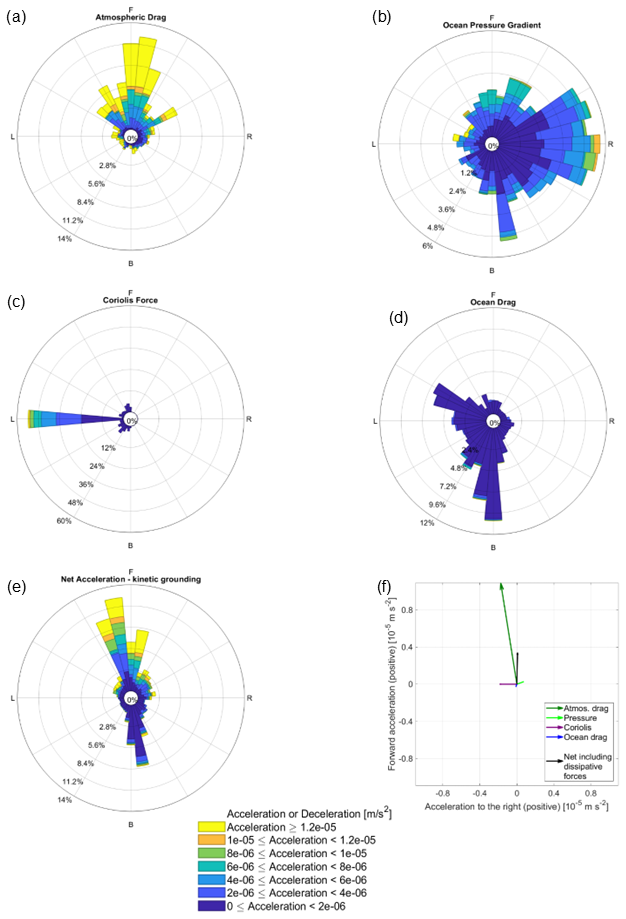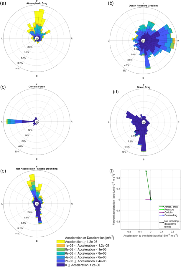 In order to fully understand the behaviour of grounded icebergs, we first explore their dynamics while they are in free flotation. Floating icebergs are driven by the combined effect of relative winds (on the iceberg's upper surface and sides of the iceberg freeboard), sea-ice drag, ocean waves, and ocean pressure gradients and relative ocean currents integrated over the depth of the submerged keel and along the iceberg's basal surface (Merino et al., 2016). Icebergs are also subject to the Coriolis force (Marsh et al., 2015; Cenedese and Straneo, 2023). The effect of tides (if represented) is indirect: tides alter the sea surface height gradients, and hence, the water column thickness, ocean pressure gradients, and ocean drag. The acceleration of a freely-floating iceberg as it moves (Bigg et al., 1996; Condron and Hill, 2021; Marsh et al., 2018) can be expressed as: