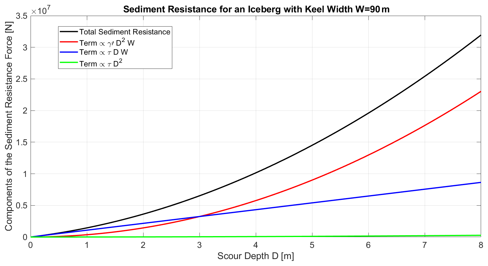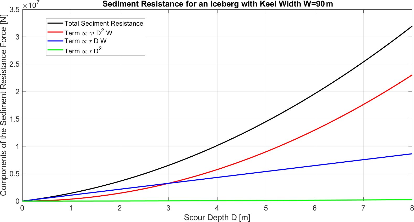 This gives rise to a three-term expression for the maximum possible sediment resistance, which acts in the direction opposite to the iceberg drift if it is in motion, or opposite to the net driving force if the iceberg is static:
