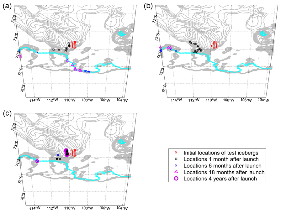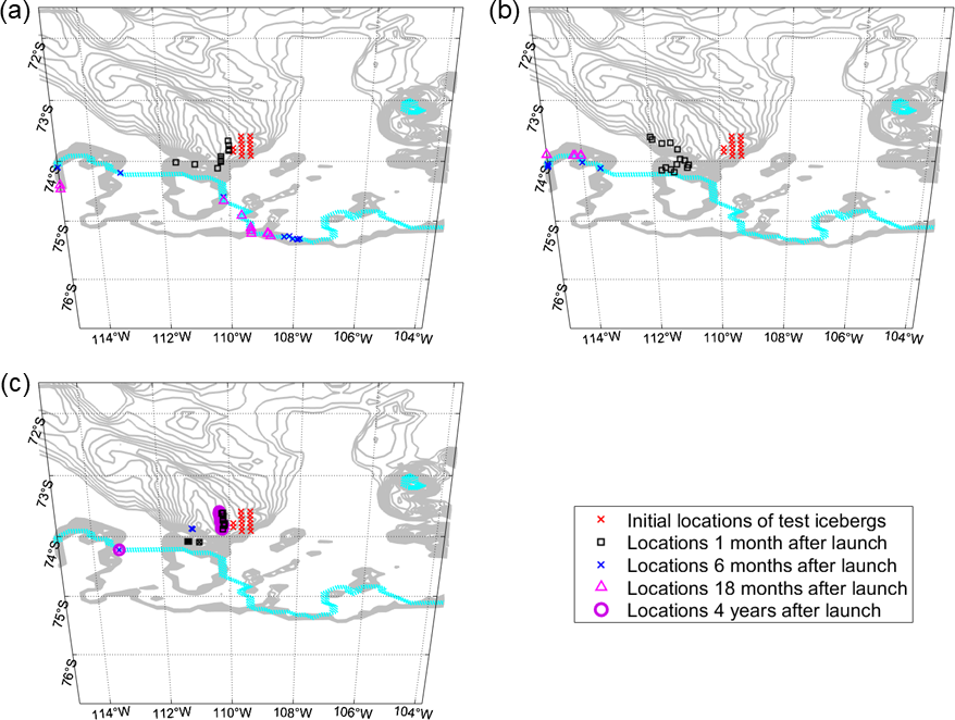 We release icebergs in January of the first year of a simulation, i.e., 1979. Our aim with these simulations is to demonstrate the new iceberg grounding physics. We are interested in a realistic historical setting, but in this study, we do not aim to explore a broad range of long-term natural variability in the Amundsen Sea and its impact on icebergs. All the icebergs in the Amundsen Sea simulations are released east of Bear Ridge and then allowed to drift, ground, and unground according to the modelled ocean, atmosphere, sea ice and iceberg conditions. We conduct two sets of tests, each with a different iceberg population. In the first set, labelled THICK hereafter, all test icebergs are tabular, with the same mass, 3.9 × 1011 kg, uniform density of 875 kg m−3, and thickness of 395 m. In the second set of tests, labelled MEDIUM, all icebergs are 250 m thick, each with mass of 3.8 × 1010 kg. However, MEDIUM icebergs are not thick enough to interact with the topography along Bear Ridge, and hence, they do not feature in our grounding analysis. We analyse the force balance of MEDIUM icebergs in free flotation.