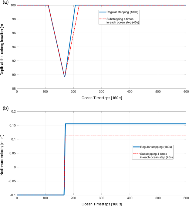 The fact that iceberg motion is computed using a separate numerical scheme within the NEMO ocean domain allows us to apply temporal substepping within the iceberg code while keeping the same time-step size for the ocean and sea-ice. We thus define a parameter that sets the ratio of the ocean timestep to the shorter iceberg timestep. We find that allowing a shorter iceberg timestep is numerically important when modelling the shape and evolution of iceberg scours because forces such as gravity along the sloping topography may act on much shorter timescales compared to other sources of acceleration. (See Appendix B, where the numerical relevance of sub-stepping is demonstrated in an idealized experiment with gravity but no dissipative forces along a sloping bottom.) At the same time, when modelling iceberg residence times and locations on the resolved ocean grid, substepping becomes less critical (Appendix B).