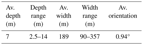 Multibeam-bathymetric data from 17 research cruises with tracks across Bear Ridge were gridded with 30 m square grid cells and visualised in ArcGIS Pro 3.3.1 and QPS Fledermaus 8.6.1 for analysis. More than 60 iceberg scours were mapped, visualised with hillshading, and their cross-sectional widths and depths measured. Overall metrics are presented in Table 1.