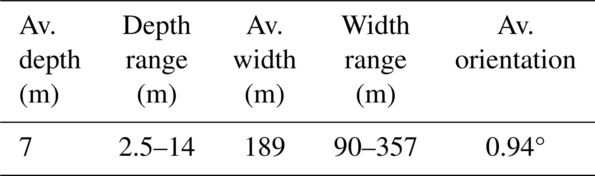 First, scours are extensive across the middle–outer continental shelf where water depths shoal sufficiently to have allowed icebergs to touch the seabed (≲ 700 m), and second, they occur on the shallow banks between the landward-deepening glacial troughs on the continental shelf (Fig. 1). Scour populations are dominated by single-keeled v- or u-shaped forms with relatively small widths and incision depths, although a few multi-keeled forms are present. A study of > 10 800 scours in Pine Island Trough (East) by Wise et al. (2017) returned average single-keel scour widths and depths of 115 and 2.8 m, respectively (ranges were 12–449 and 0.1–22 m). Further west, on the banks around the Dotson–Getz glacial trough, typical scour widths and depths are 100–250 and 4–10 m, respectively (Graham et al., 2009).
