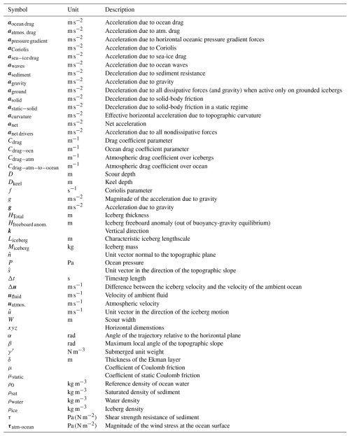 where terms on the right-hand side denote accelerations due to the ocean pressure gradient, the Coriolis force, ocean drag, atmospheric drag on icebergs, sea-ice drag, and wave drag (see Table D1 for a list of all symbols used). Importantly, grounded icebergs are also decelerated by an additional term, aground which represents the sum of all dissipative forces acting on an iceberg. We assume that there is no continuous field of interacting icebergs, and so ∇u = 0 because icebergs are treated as isolated rigid, solid bodies (in NEMO they are in fact represented as moving point particles when it comes to advection).