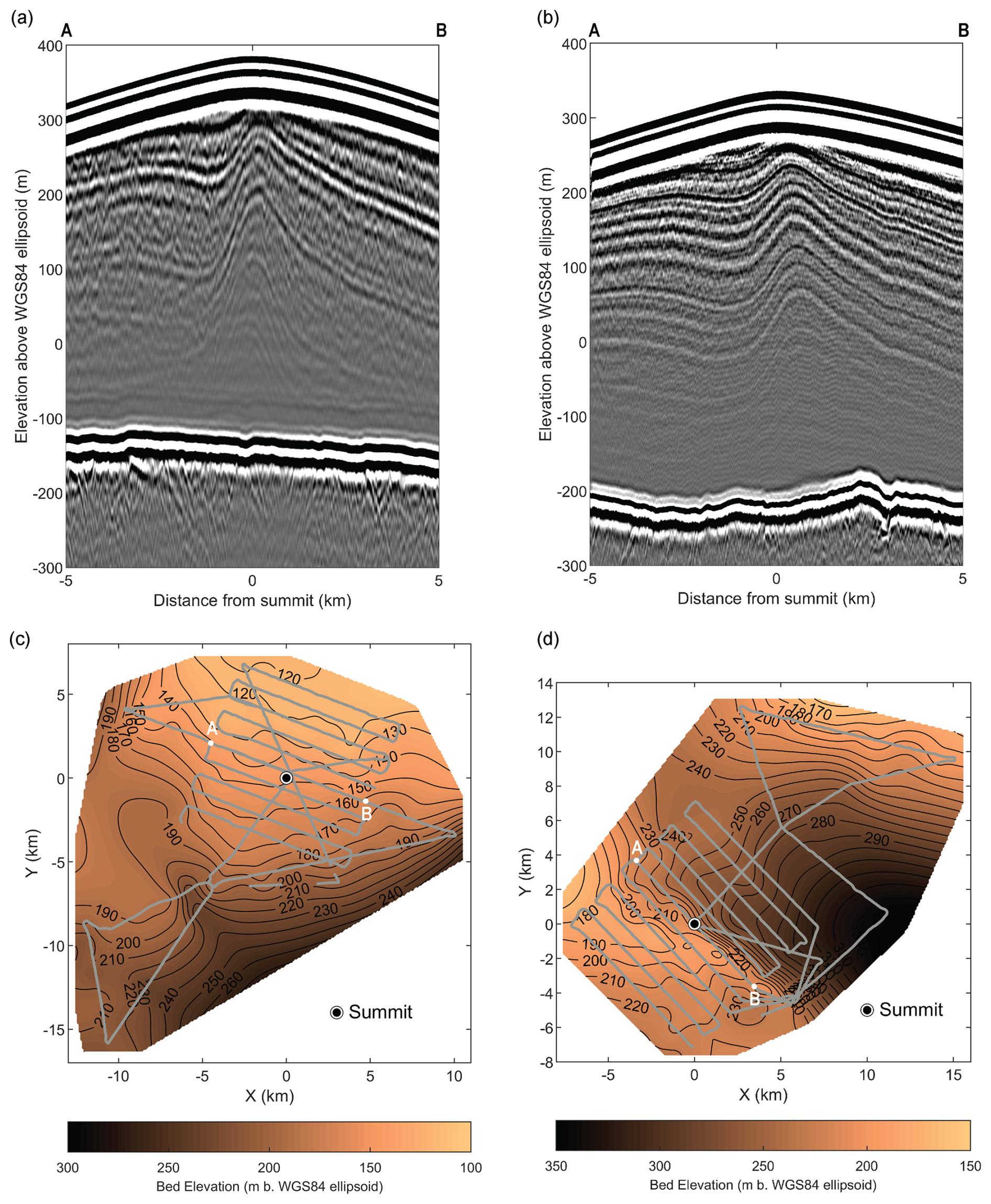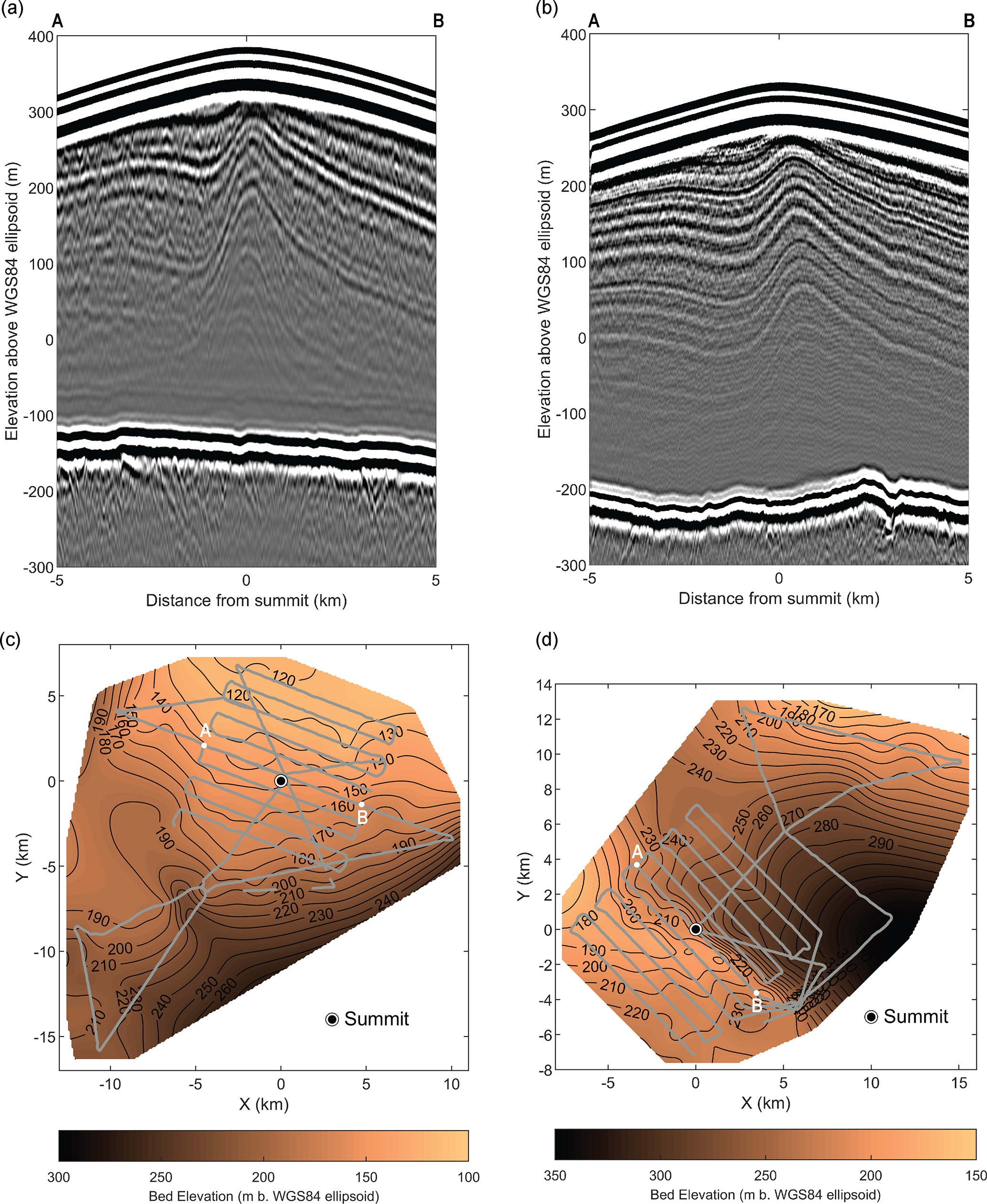 Figure 2Deep-sounding radargrams and bed elevation maps. (a–b) 10 km-long deep-sounding radargram profiles going across the summits of KAM (Fig. 1b) and VER (Fig. 1c). The ends of these profiles (A and B) are marked in (c)–(d). (c)–(d) show the bed elevation maps for KAM and VER, respectively, with grey curves showing the location of the radar profiles used to generate these maps. The black curves show the bed elevation contours at 20 m intervals, with the labels showing the elevation below the WGS84 Ellipsoid in meters. A and B markers show the radargrams' starting and end points in (a) and (b).